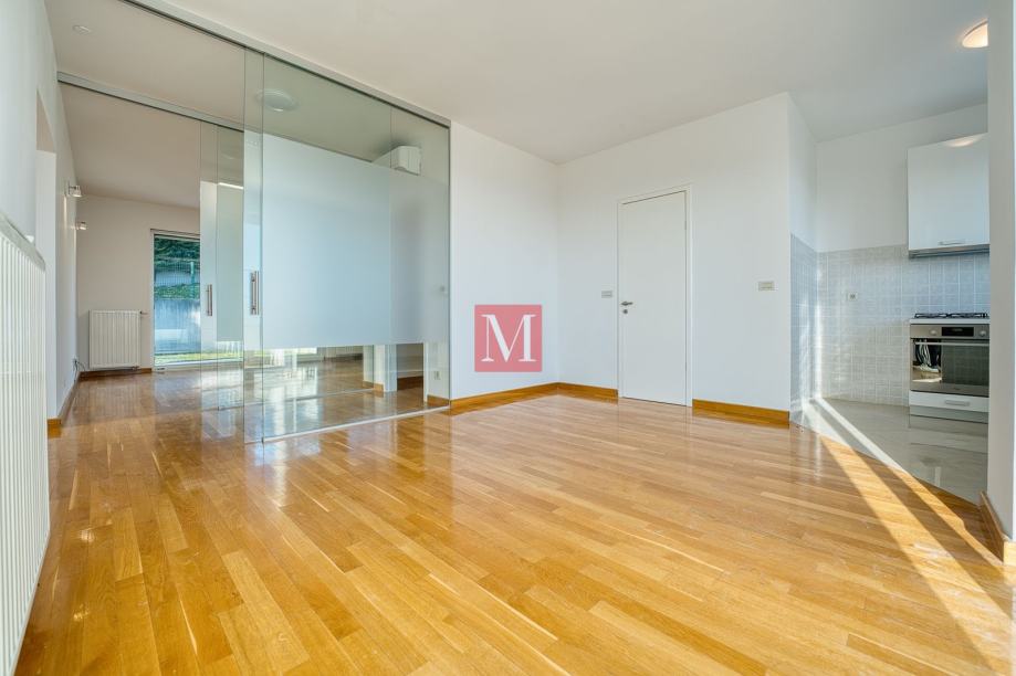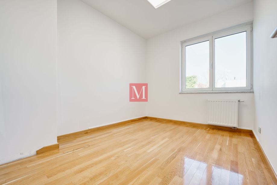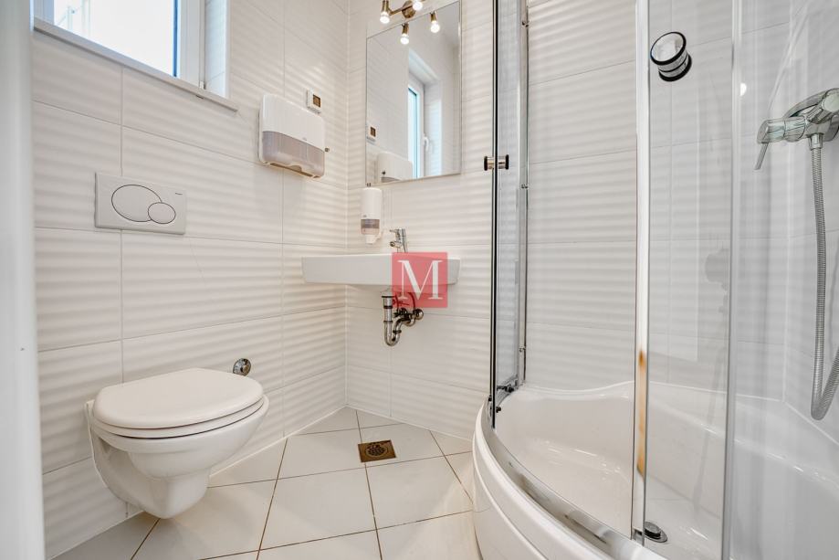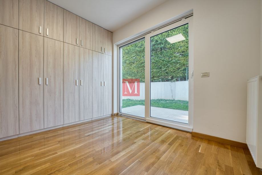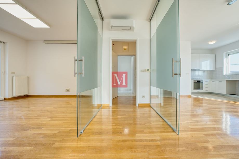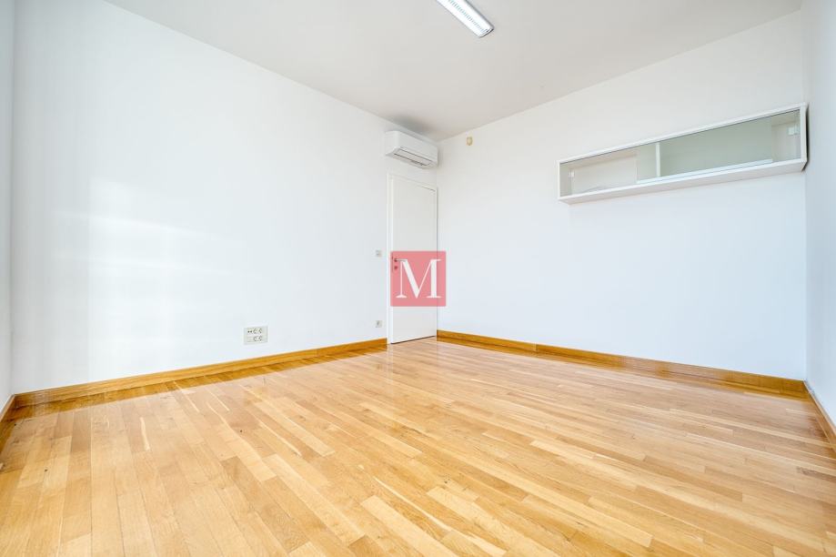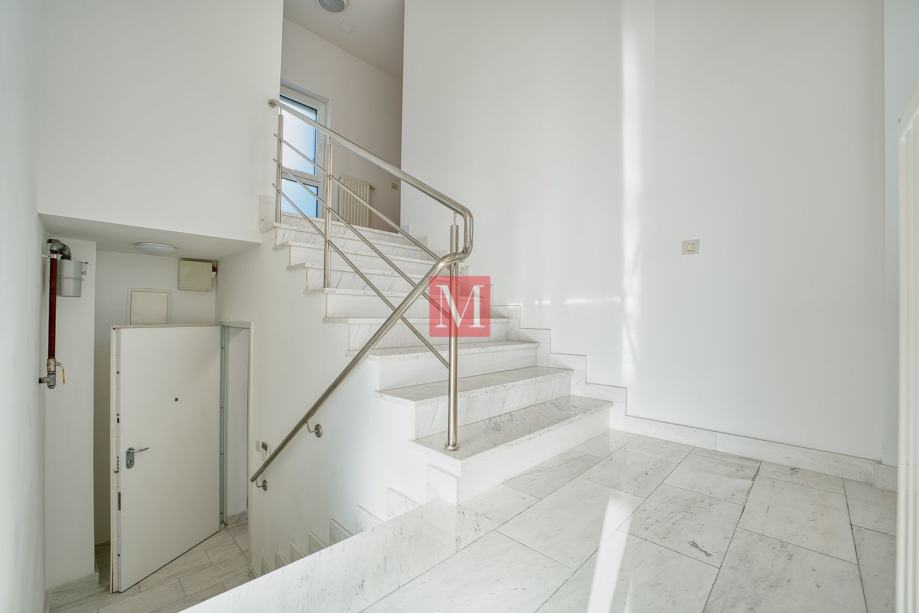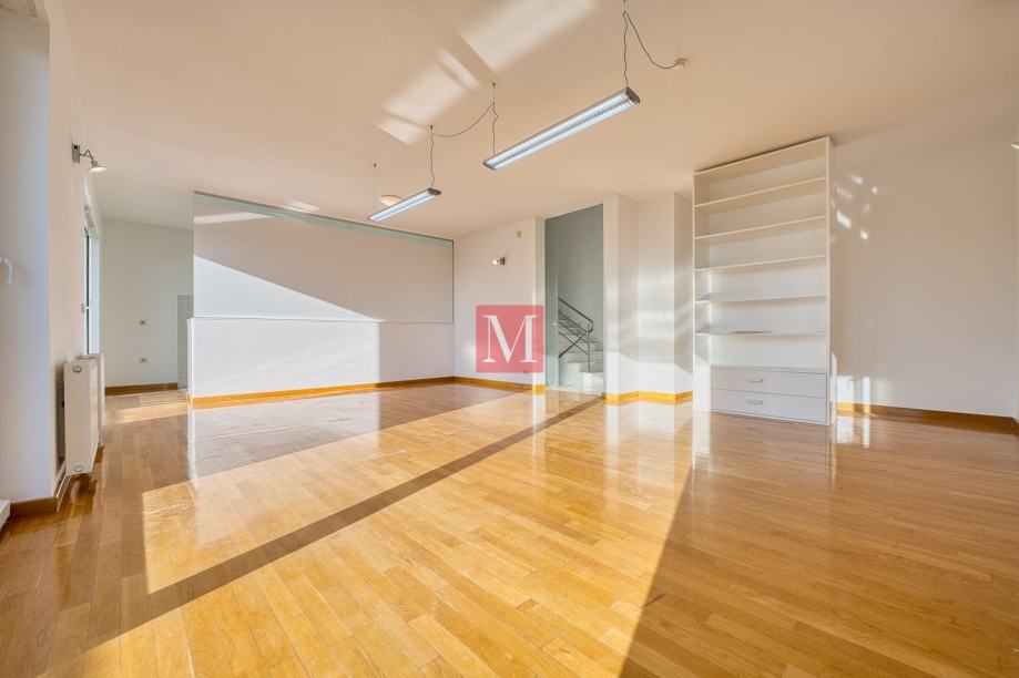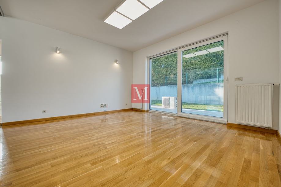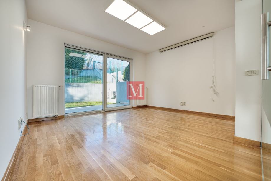 Dvoetažni četverosobni uredski prostor/stan u podrumu i prizemlju: ulazni hodnik, velika uredska prostorija, kuhinja, toalet, tri uredske prostorije, stubište, kupaonica s toaletom, spremište i dvije polunatkrivene terase i balkon. Također stanu pripada vanjsko parkirališno mjesto(12,50m2), vrt(208m2), spremište(6,50m2) u podrumu i garaža(30m2).