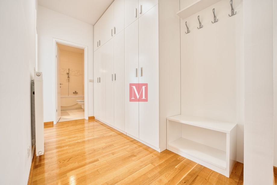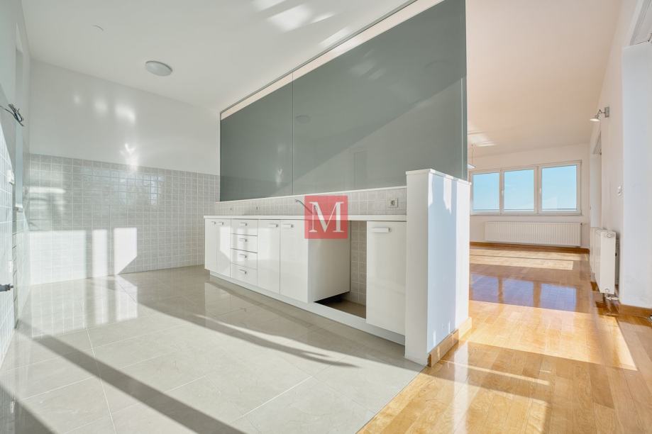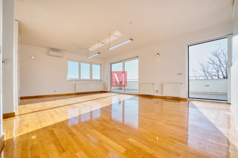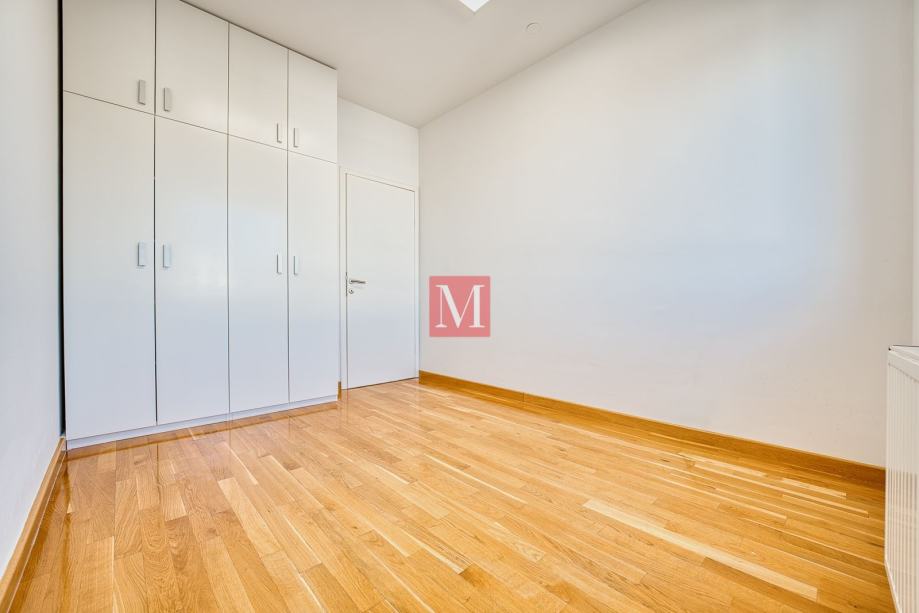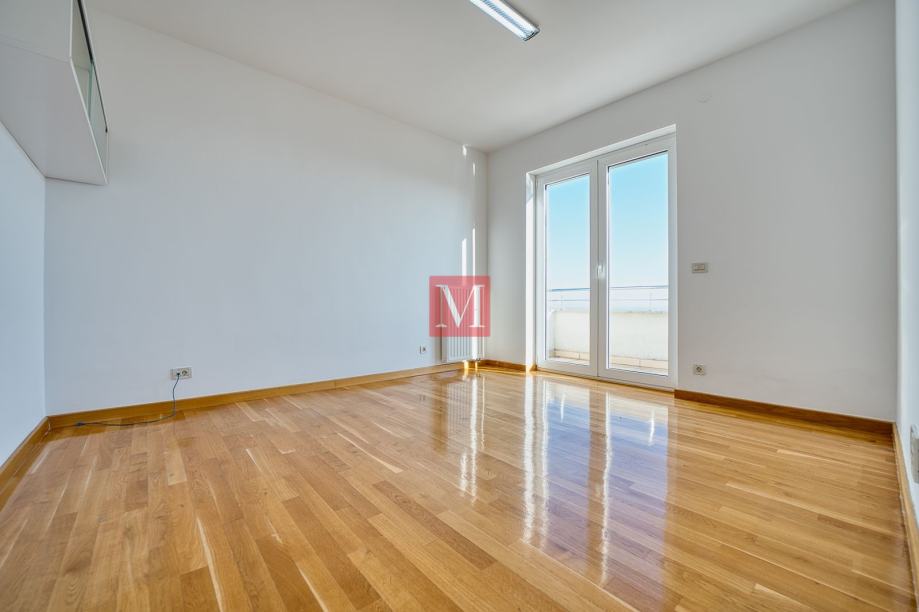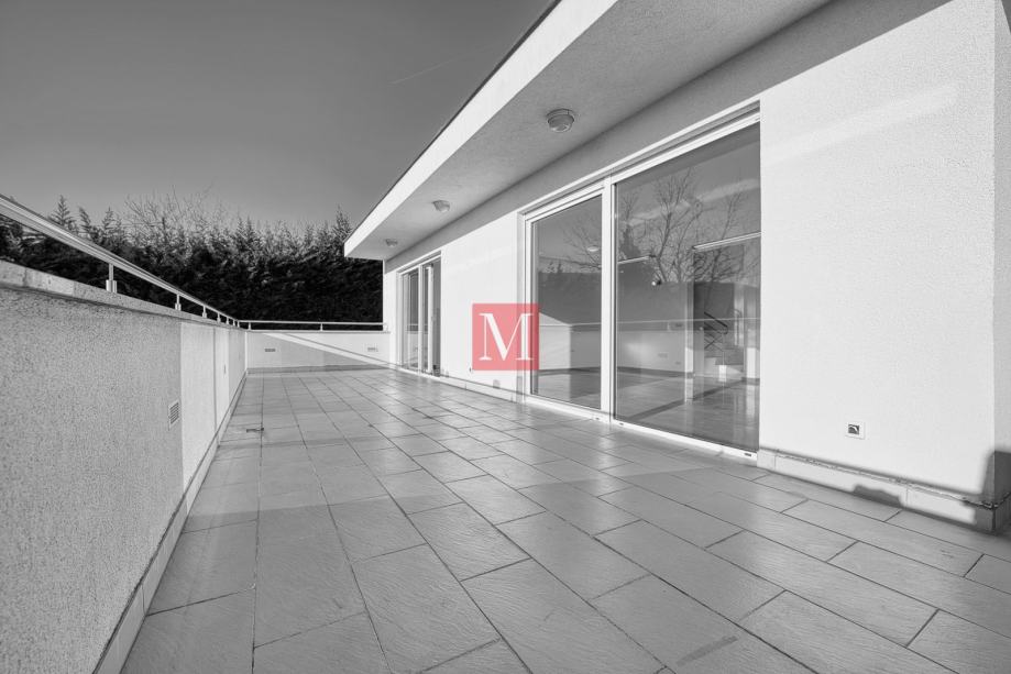 Penthouse: ulazni hodnik, velika prostorija, kuhinja, dvije kupaonice s toaletom, tri sobe, garderoba, galerija, ostava, loggia, terasa i balkon. Pripada mu i vanjsko parkirališno mjesto(12.50m2) i garaža(15m2).