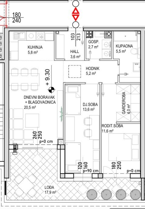 Stan se nalazi u penthouseu zgrade te se sastoji od ulaznog prostora, gospodarstva, kupaone, kuhinje, dnevnog boravka te blagovaonice otvorenog tlocrta s izlazom na lođu, dječje sobe i spavaće sobe s garderobom. Neto stambena površina stana je 72,5 m2, a lođa je ukupne površine (bez koeficijenta) 17,9 m2. Zasebno se kupuje parkirno mjesto (vanjsko ili garažno) te spremište u podrumu.