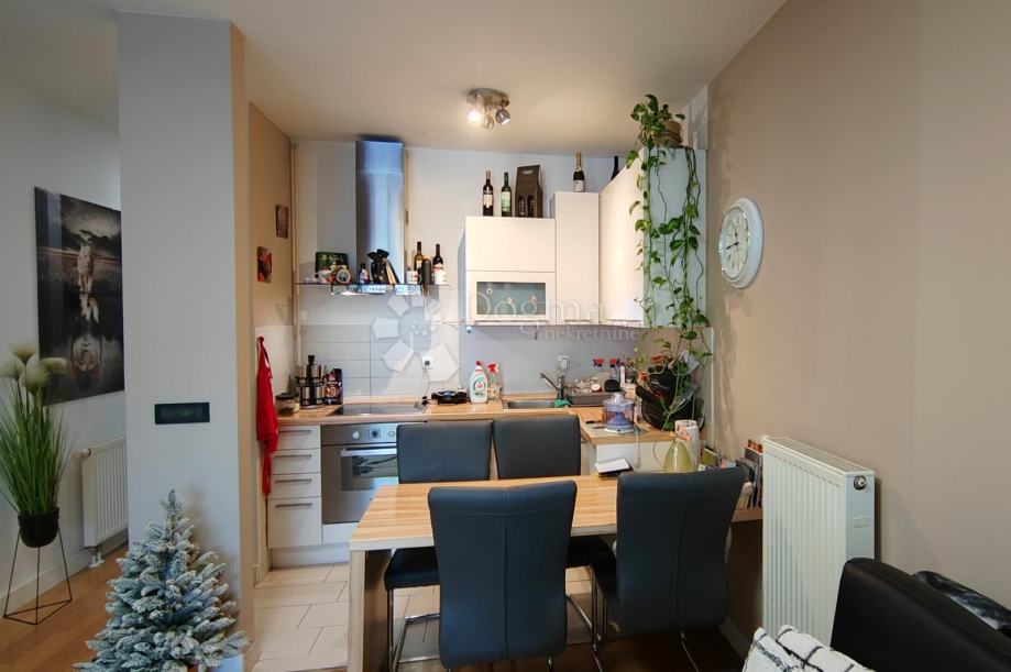 Ulazni hodnik vodi prema prostranom dnevnom dijelu koji je povezan s kuhinjom i blagovaonicom u otvorenom konceptu, stvarajući svijetao i ugodan prostor za boravak. Spavaća soba je odvojena, što pruža dodatnu privatnost i mir, dok velika ostakljena lođa daje dodatnu vrijednost stanu.