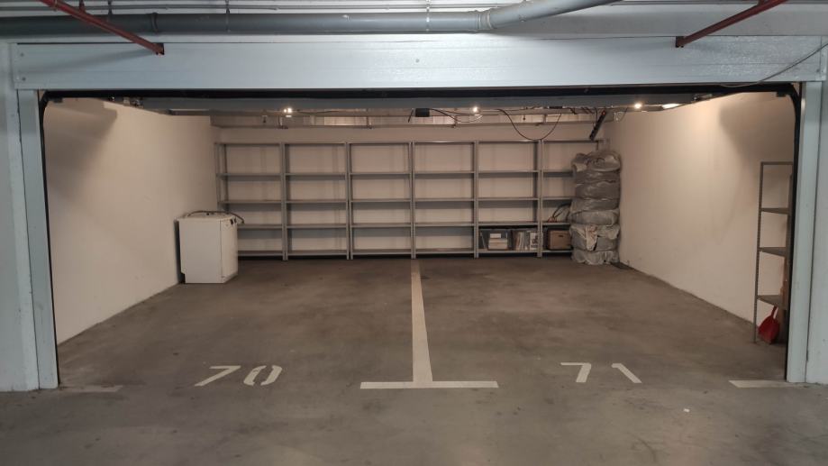 Ima ugrađena automatska sekcijska vrata na daljinsko otvaranje, ugrađene metalne police preko cijelog zida i rasvjetu.