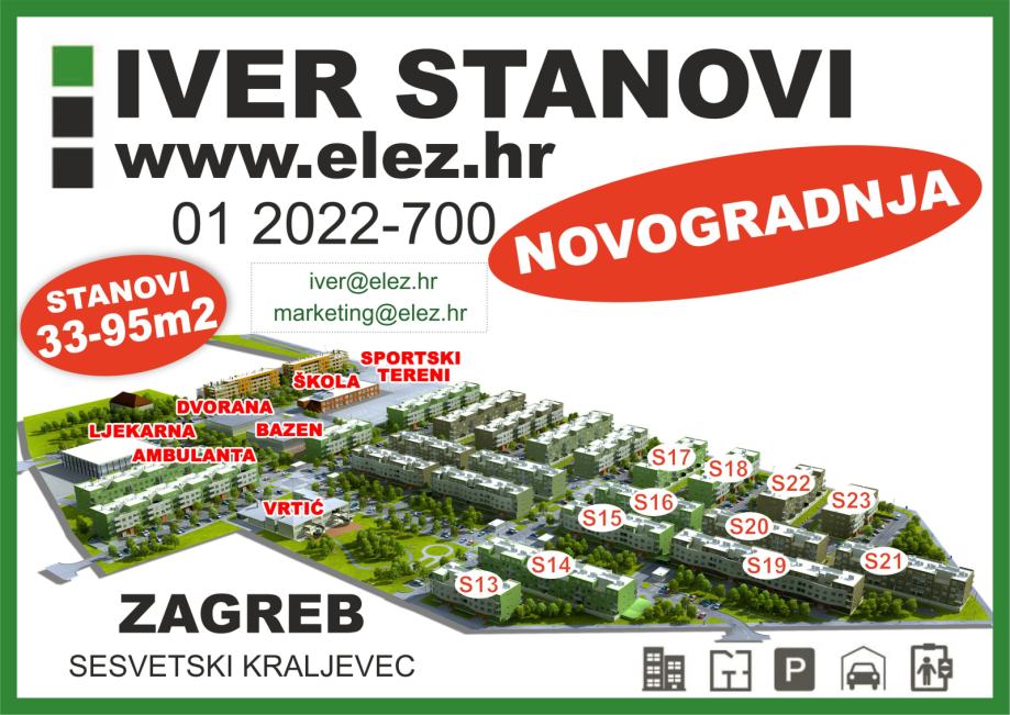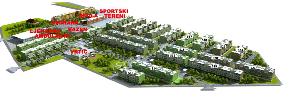 Od jednosobnih do četverosobnih, dostupne veličine stanova su od 30-95 m2. Škola i vrtić modernog su dizajna, a organizacijom prostora prilagođeni su suvremenom načinu obrazovanja. NOVA ŠKOLA, VRTIĆ, BAZEN, SPORTSKI TERENI, ŠPORTSKA DVORANA, AMBULANTA, LJEKARNA, TRGOVINA i mnogi drugi sadržaji pojednostavit će život i uštedjeti dragocjeno vrijeme obiteljima, ali i mladima koji započinju samostalan život. Cijelo naselje okruženo je biciklističkim i rolerskim stazama, dok prometnice unutar naselja osiguravaju lagan i jednostavan promet kroz naselje te brzu fluktuaciju u poslovnoj zoni, pritom ne ugrožavajući bezbrižno kretanje pješaka, djece u igri ili biciklista.