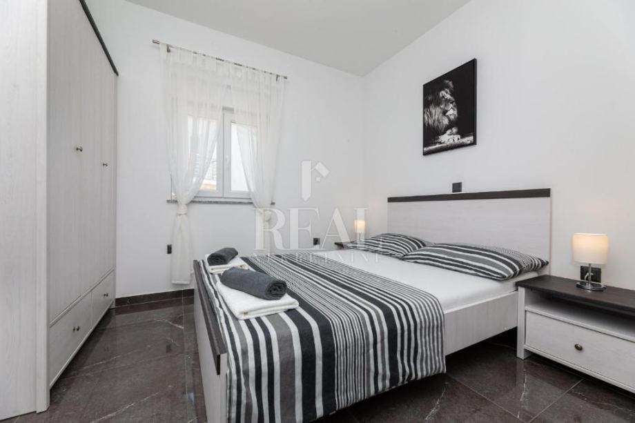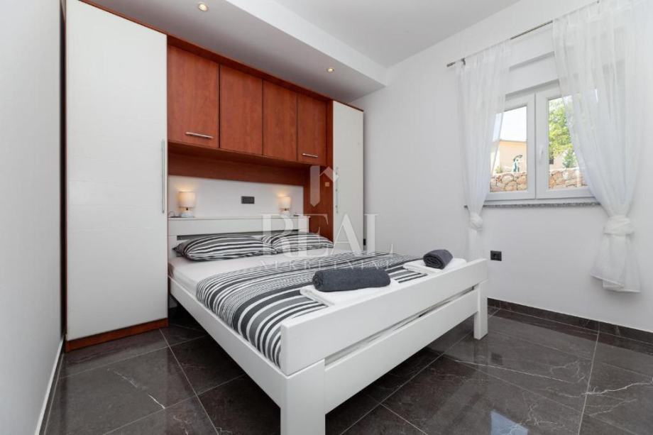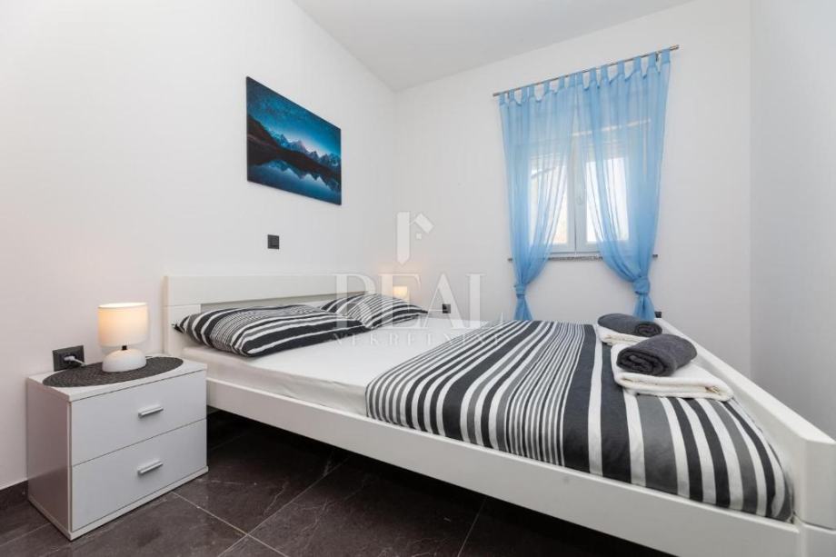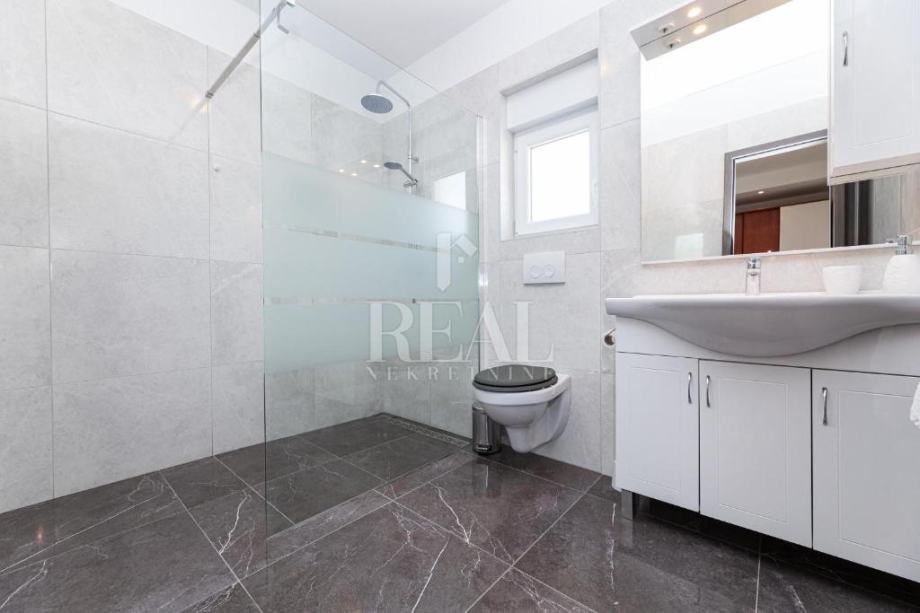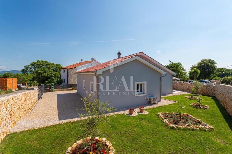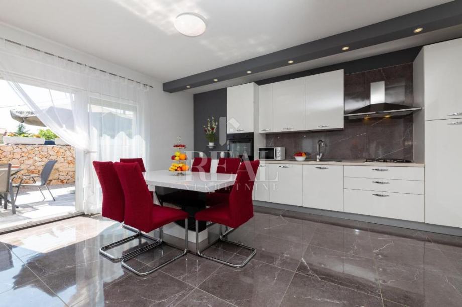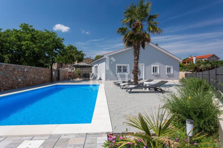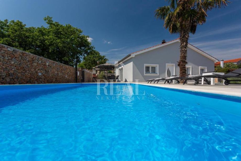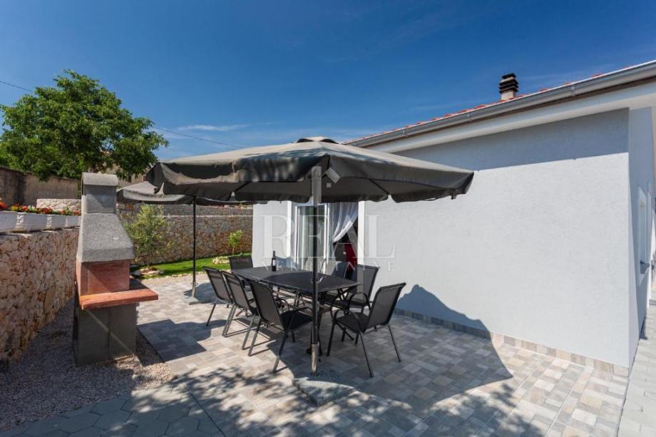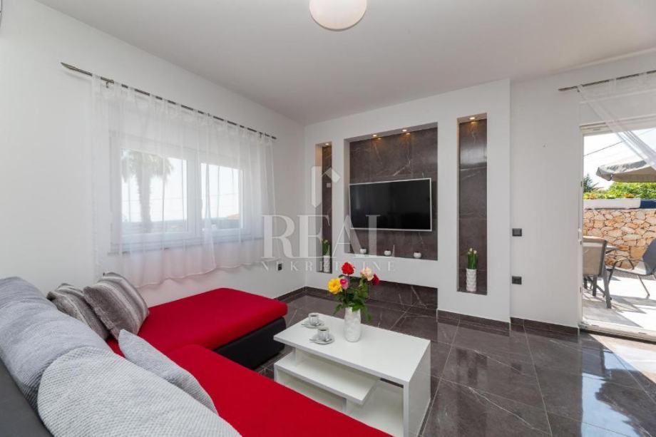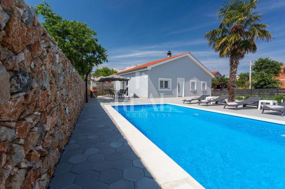 Samostojeća prizemnica površine 90 m2 koja se sastoji od kuhinje sa dnevnim boravkom, tri spavaće sobe, kupaone i terase. Na uređenoj okućnici u zelenilu se nalazi bazen i sunčalište .Kući pripada 4 parkirna mjesta. Prodaje se potpuno namještena.