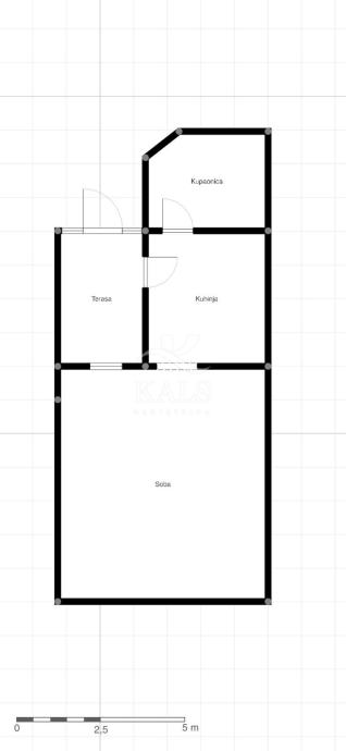 Garsonijera se sastoji od prostrane sobe i blagovaonice, kuhinje, kupaonice sa WC-om i terase.