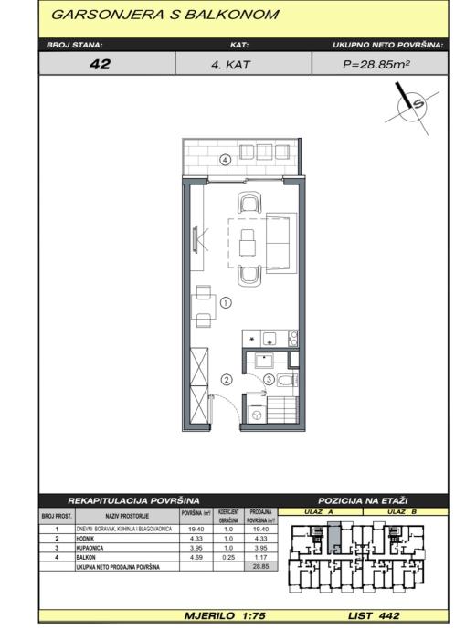 Garsonijera S42 (4.kat) - 28,85m2 = 115.400,00€