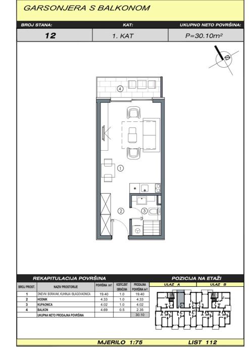 Garsonijera S12 (1.kat) - 30,10m2 = 120.400,00€