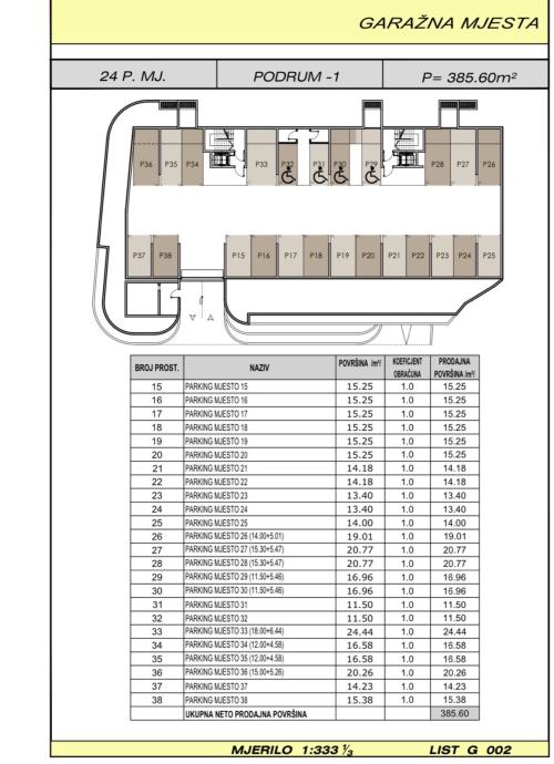 Ova zgrada nudi 14 vanjskih parkirnih mjesta ispred zgrade te 48 garažnih mjesta u podrumu. Kupnja stana uvjetovana je kupnjom garažnog mjesta. Cijene ovise o kvadraturi i poziciji: garažno mjesto od 15m2 - 20.000 Eura, garažno mjesto od 20m2 - 25.000 Eura. Uz kupnju stana uvjet je kupnja garažnog mjesta.