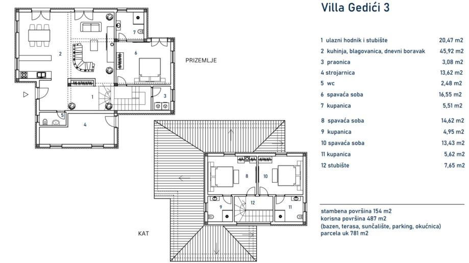 Vila se nalazi na izvrsnoj lokaciji te će biti izgrađena tijekom 2025 godine. Njezina površina iznosi 154 m2, a sastoji se od ulaznog hodnika, stubišta, kuhinje, open-space blagovaonice i dnevnog boravka, tri spavaće sobe, tri kupaonice te bazena, sunčališta, natrkivenog parkinga i terase.