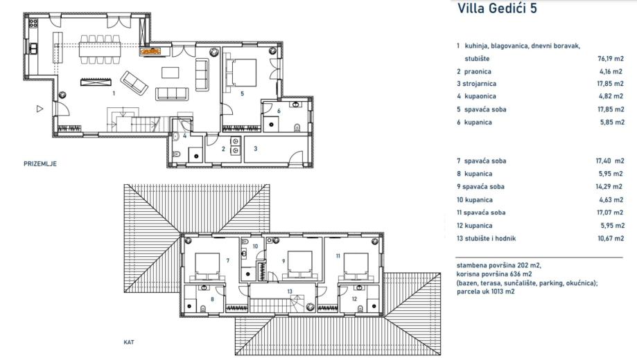 Vila 5 se nalazi na izvrsnoj lokaciji te će biti izgrađena tijekom 2025 godine. Njezina površina iznosi 202 m2, a sastoji se od ulaznog hodnika, stubišta, kuhinje, open-space blagovaonice i dnevnog boravka, četiri spavaće sobe, pet kupaonice te bazena, sunčališta, natrkivenog parkinga i terase.
