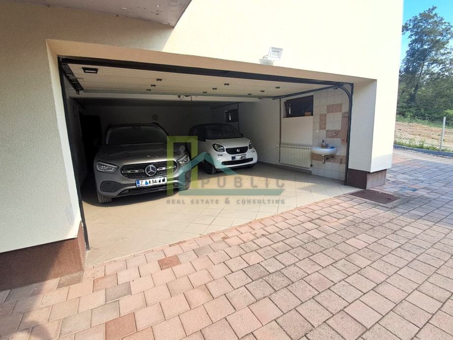 U prizemlju spremište, ostava, kotlovnica, vešeraj, toalet, te velika garaža za dva vozila. Vrhunski uređena okućnica i vrt, dva natkrivena parkirna mjesta te mogućnost parkiranja više vozila u dvorištu. Grijani put do vanjskih parkirnih mjesta i garaže, kao i u samoj garaži.