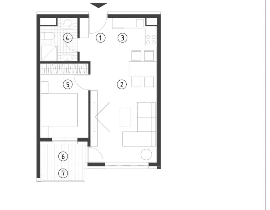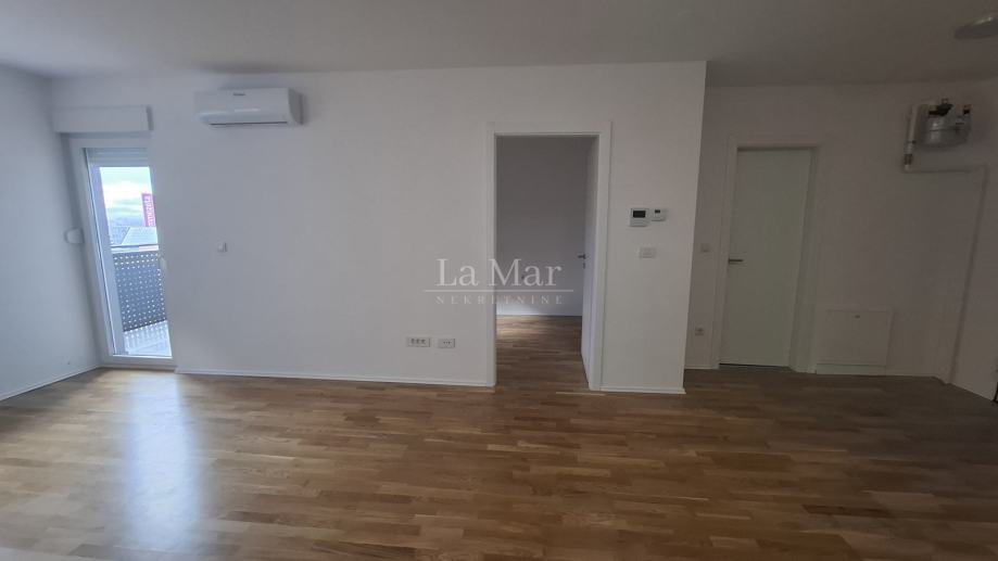 Sastoji se od dnevnog boravka i blagovaonice, kuhinje, kupaonice i spavace sobe, balkona te pripadajućeg spremišta u zgradi. Stan se prodaje nenamješten sa novom kuhinjom po mjeri koja šankom odvaja prostrani dnevni boravak.