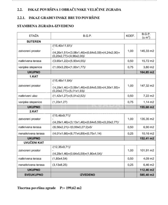 Kuća ukupne površine 585,40 m2 je katnosti: suteren, 1.kat, 2.kat i uvučeni kat.