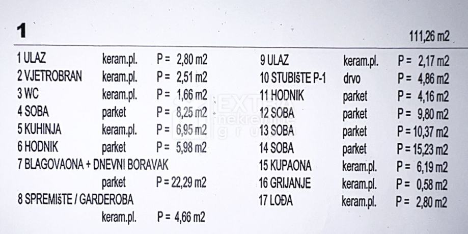 Ima sveukupno 111,26 m2. Stan će biti opremljen sa protuprovalnim vratima, parketom, keramikom po izboru kupca, podnim grijanjem (dizalica topline), 2 klime, PVC Salamander troslojna stakla (antracit vani), alu rolete, 15 cm fasada, sanitarije po izboru u Zomar Vrbovec, vanjske balkonske ograde obložene s antracit staklom. Stanu pripadaju 2 parking mjesta koja su uključena u cijenu stana. Ima terasu koja se nalazi iza objekta.