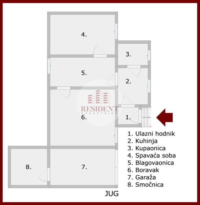 - prizemlja u kojem se nalazi: predsoblje, kuhinja, kupaonica, blagovaonica, spavaća soba i boravak