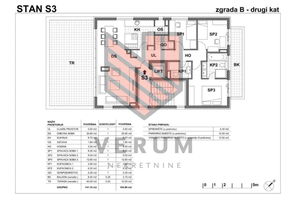 Stanu pripada spremište (NKP 4.30m2), garažno parkirno mjesto (NKP 6.25m2), vanjsko parkirališno mjesto (NKP 3.125m2), što sa stanom čini ukupnu netto korisnu površinu od 128.55m2.