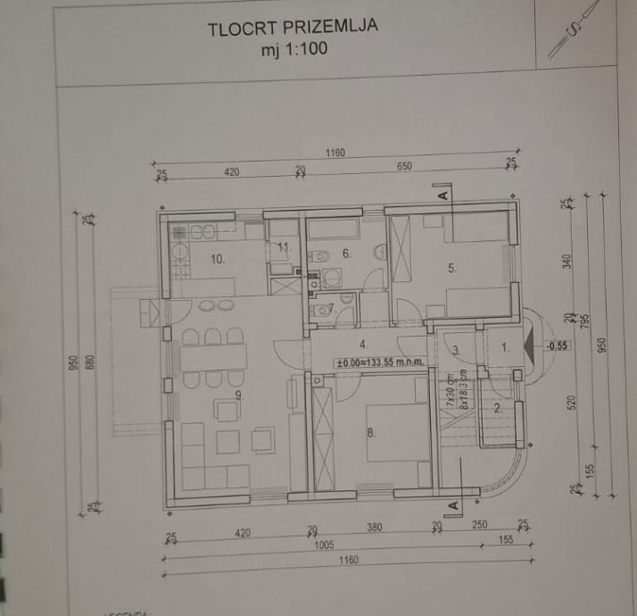 Prizemlje je potpuno uređeno i useljivo: sadrži veliki dnevni boravak s kuhinjom i blagovaonicom, dvije spavaće sobe, hodnik i kupaonicu.