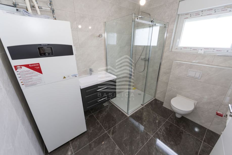 OPREMA:- Konstrukcija cigla, pregradbeni zidovi knauf- Izolacija – termo fasada stiropor- PVC stolarija rehau, troslojno staklo - dizalice topline i podno grijanje- klima u dnevnom boravku- pločice prve klase u kupaonicama, parket u ostatku kuće