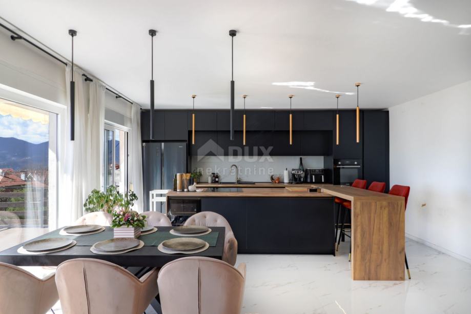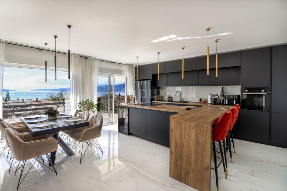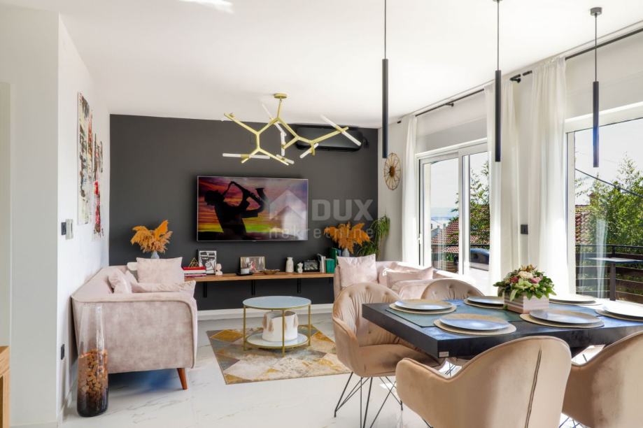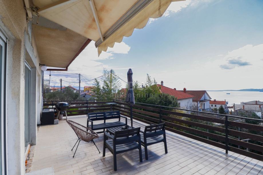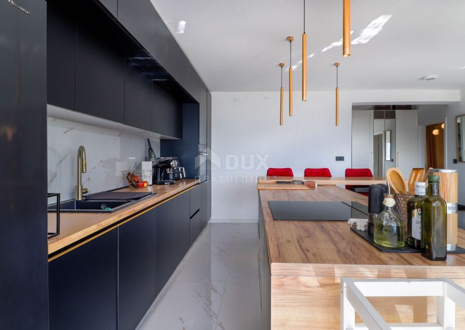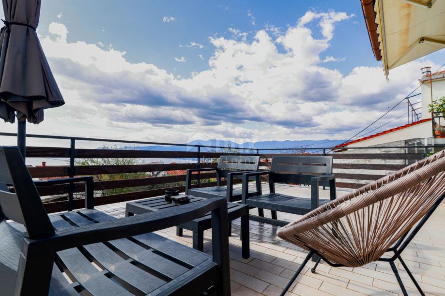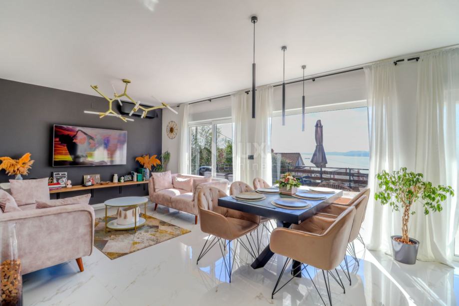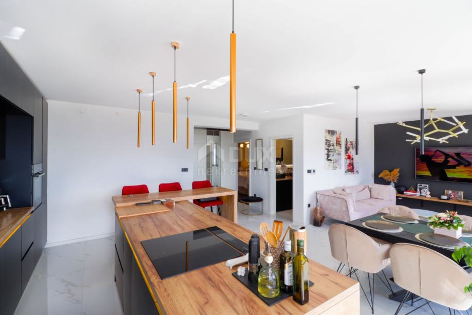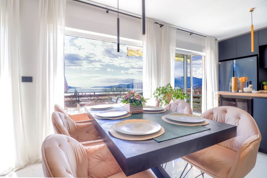 Stan na katu sastoji se od hodnika, kupaonice, dvije spavaće sobe, prostranog dnevnog boravka s kuhinjom i blagovaonom ukupne površine 80 m2 te terase od 40 m2 s panoramskim pogledom na more.