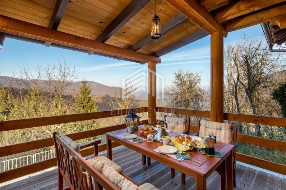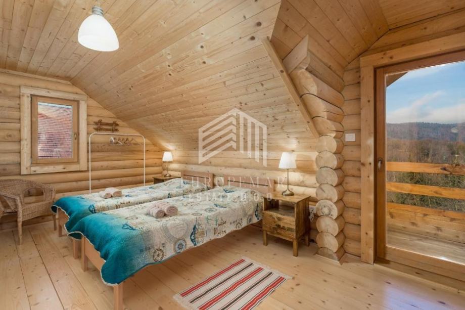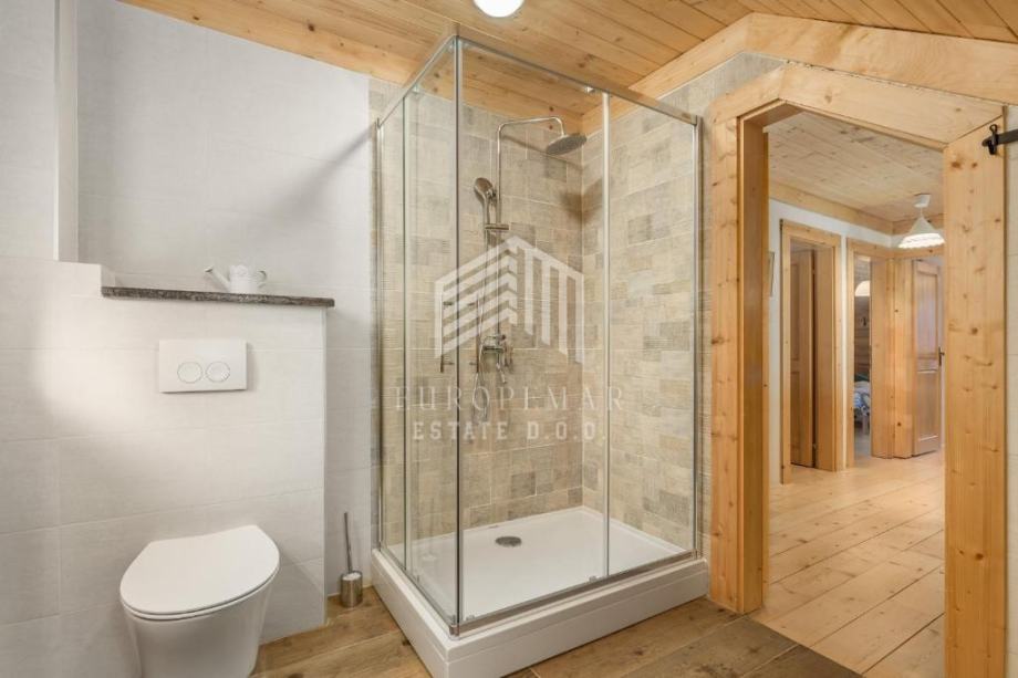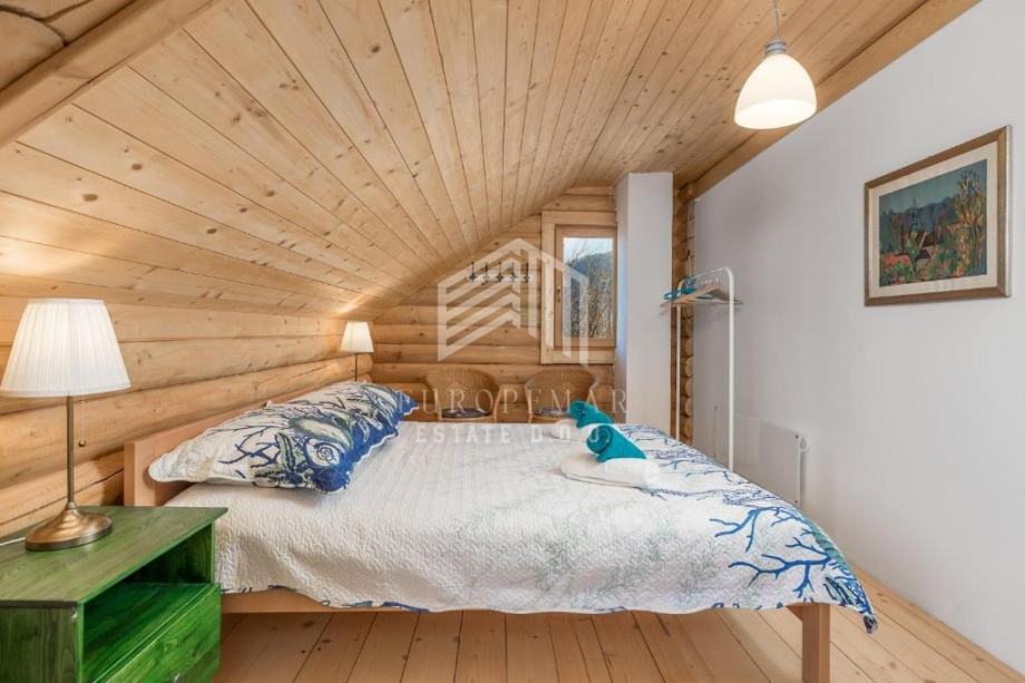 U visokom potkrovlju smještene su tri spavaće sobe, dodatna kupaonica i manji balkon s očaravajućim pogledom na okolne planine i Sloveniju.