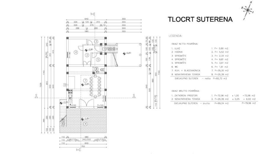 U suterenu, čija netto površina iznosi 59,34 m², planirano je uređenje ulaznog prostora, hodnika, tri spremišta, WC-a te kuhinje s blagovaonicom koja ima izlaz na prostranu nenatkrivenu terasu od 26,38 m². Glavni ulaz u kuću vodi preko atraktivne drvene nadstrešnice izrađene od trupaca, površine 20,54 m², koja prostoru daje rustikalnu toplinu i dodatnu estetsku vrijednost.