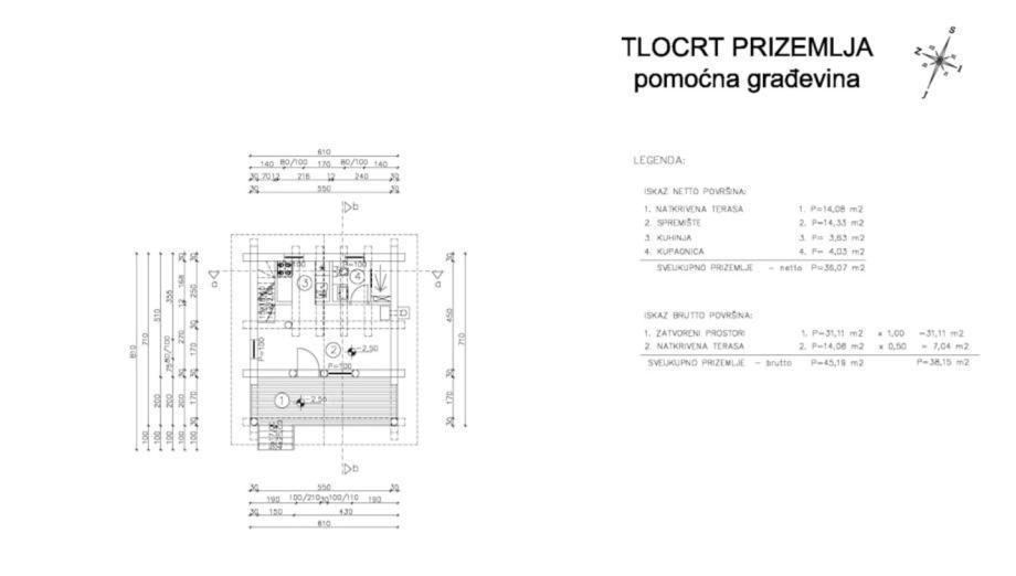 Na parceli je već izrađena i betonska ploča za pomoćni objekt ukupne netto površine 36,07 m², koji prema projektu uključuje kuhinju, kupaonicu, spremište i natkrivenu terasu. Ova dodatna jedinica nudi brojne mogućnosti, od gostinjske kuće do funkcionalnog prostora za odmor i druženje.