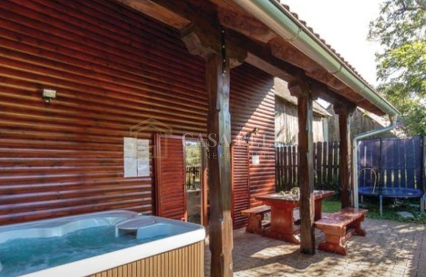 Kuća se sastoji od prizemlja i etaže. U prizemlju se nalazi manja ostava, ulazni hodnik, kupaonica, spavaća soba, kuhinja sa blagovaonicom i dnevnim boravkom koji ima izlaz na vanjsku terasu. Vanjska terasa je uređena za opuštanje i uživanje, a na njoj se nalazi roštilj, stol sa klupama, trampolin, a za potpunu relaksaciju tu je i jacuzzi.