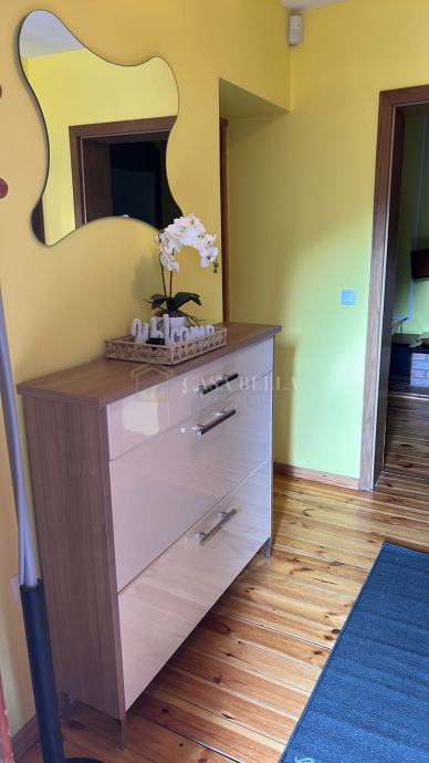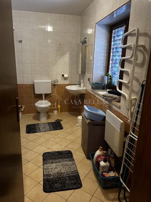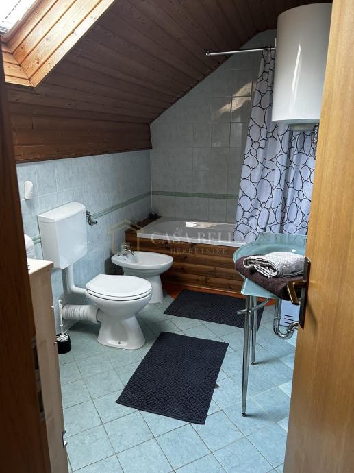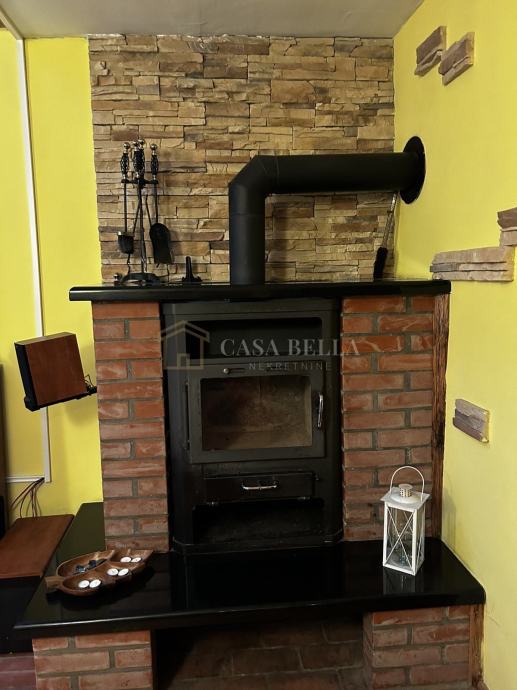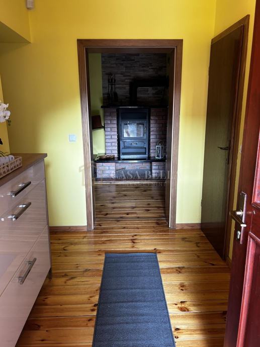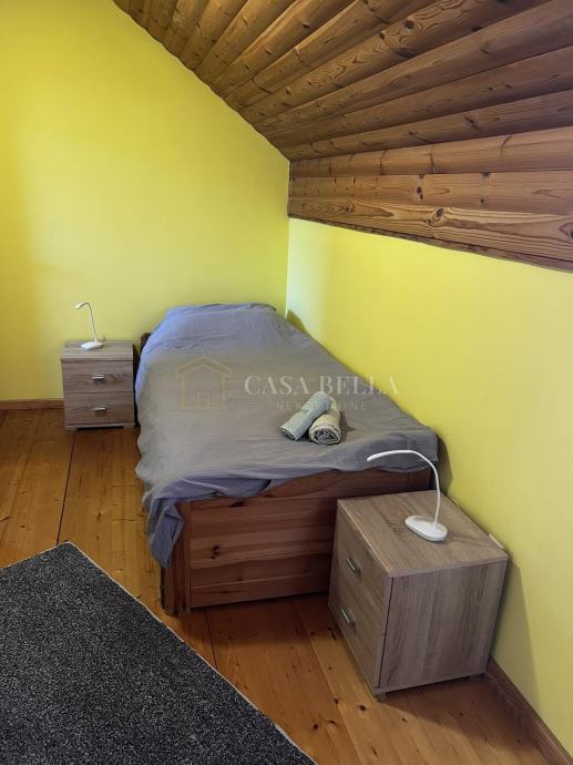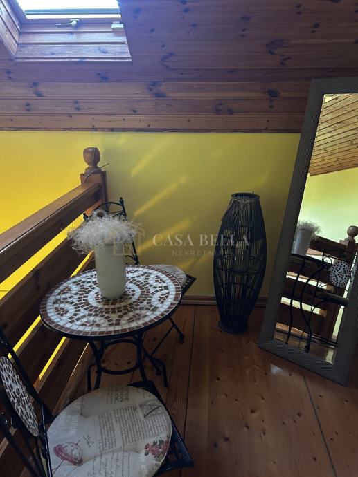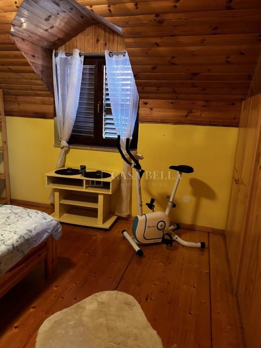 Na gornjoj etaži se nalazi predsoblje, dvije prostrane spavaće sobe i kupaonica. Okućnica je uređena i ograđena, a na njoj je smještena manja drvarnica i nadstrešnica za automobile.