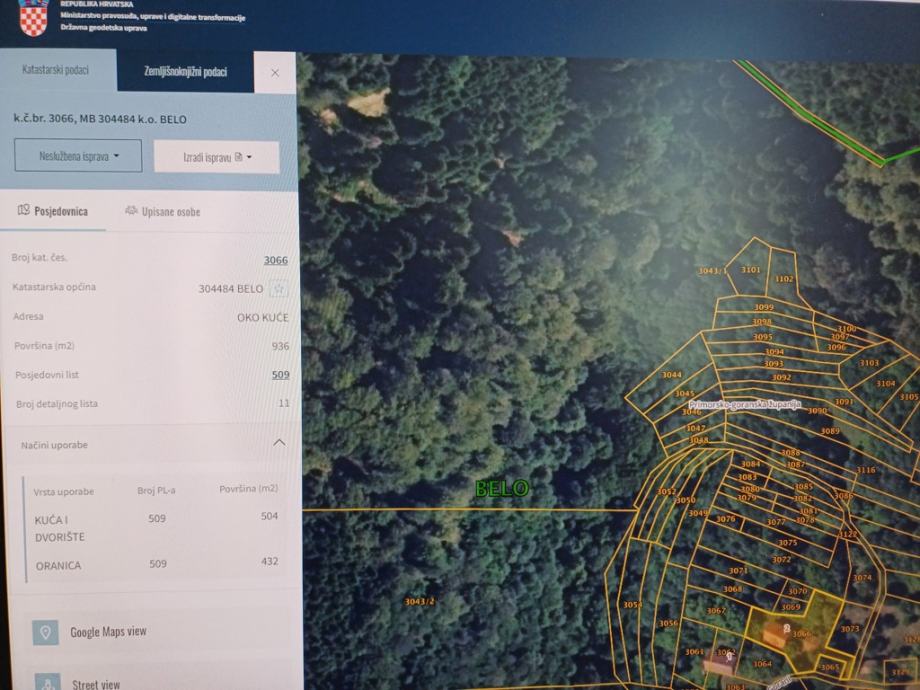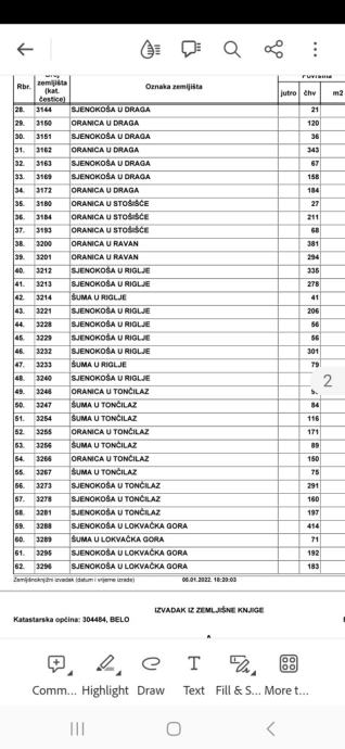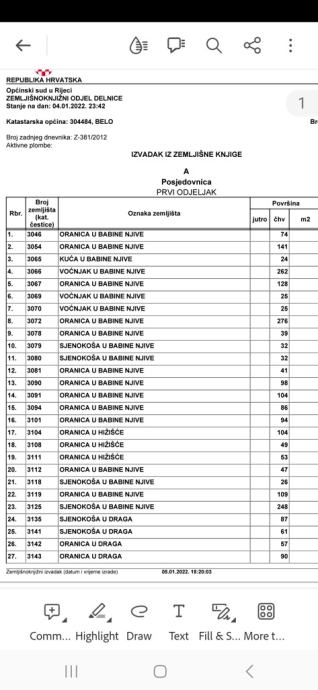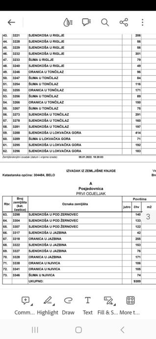 Zemljište je podijeljeno na 73 parcele i isto je vidljivo na priloženom vlasničkom listu (dio su nekad bile oranice, voćnjaci, livade i pašnjaci). Vlasništvo 1/1. Bez tereta.