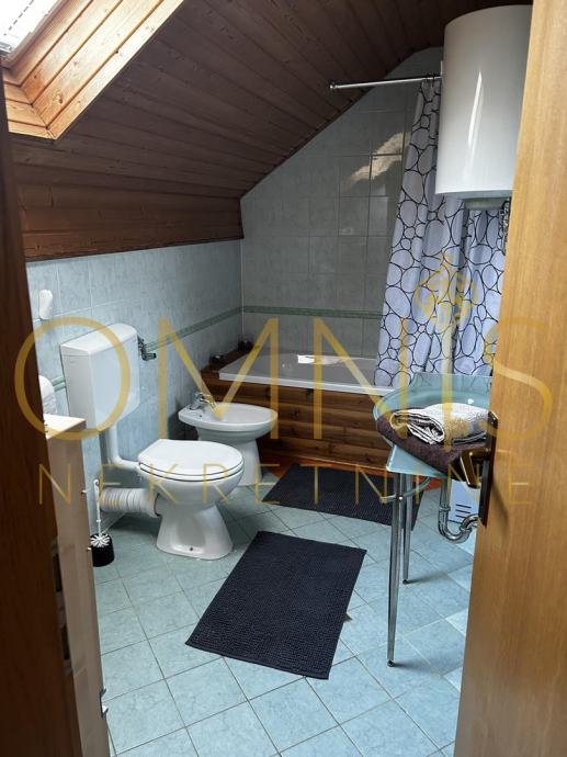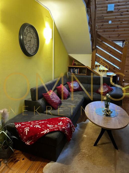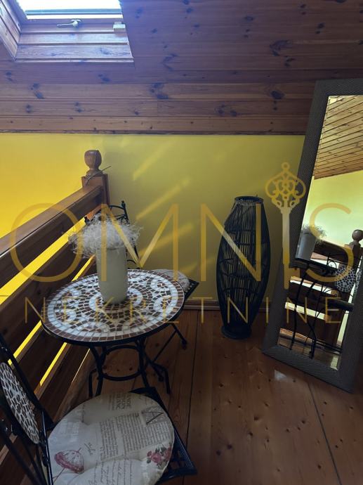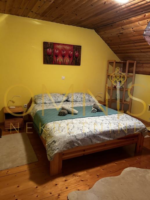 U prizemlju kuće nalazi se dnevni boravak, kuhinja s blagavaonom, spavaća soba, kupaona i ostava. Iz dnevnog boravka se izlazi na natkrivenu terasu na kojoj se nalazi roštilj, jacuzzi, trampolin i drvena sjedeća garnitura. Na katu se nalaze dvije spavaće sobe, galerija i kupaona.