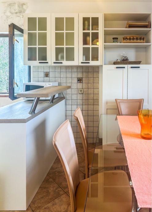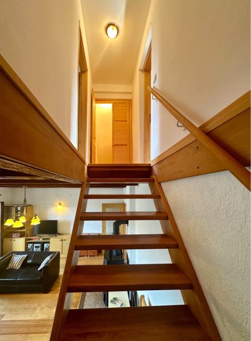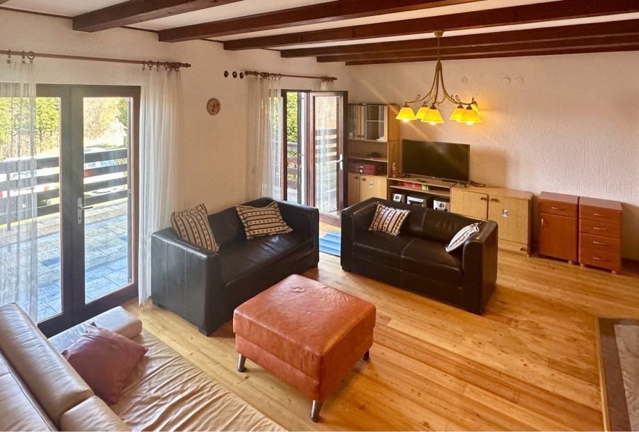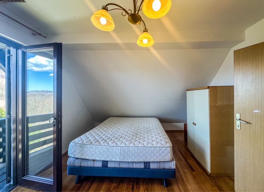 Nekretnina se prostire na tri etaže s potkrovljem: u prizemlju su garaža, konoba i natkrivena terasa, na prvom katu potpuno nova kuhinja, kupaonica i prostrani dnevni boravak s kaminom te velika terasa s pogledom na Julijske Alpe, dok su na drugom katu dvije spavaće sobe, garderoba i balkon, a potkrovlje nudi mogućnost dodatne adaptacije. Građena u kombinaciji kamena i drva te opremljena centralnim grijanjem na drva, kuća spaja toplinu doma s prirodnim ugođajem planine.