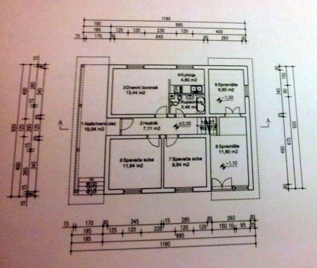 - prizemlje: dnevni boravak, kuhinja, kupaonica, 2 sobe, hodnik, 2 spremišta