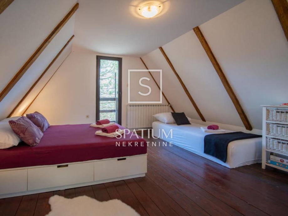 Potkrovlje: prostrani spavaći prostor za šest osoba, s izlazom na dvije terase. Kuća je dodatno opremljena podnim grijanjem, centralnim grijanjem na pelete, ima montažni bazen, saunu i jacuzzi, te vlastito parkiralište.