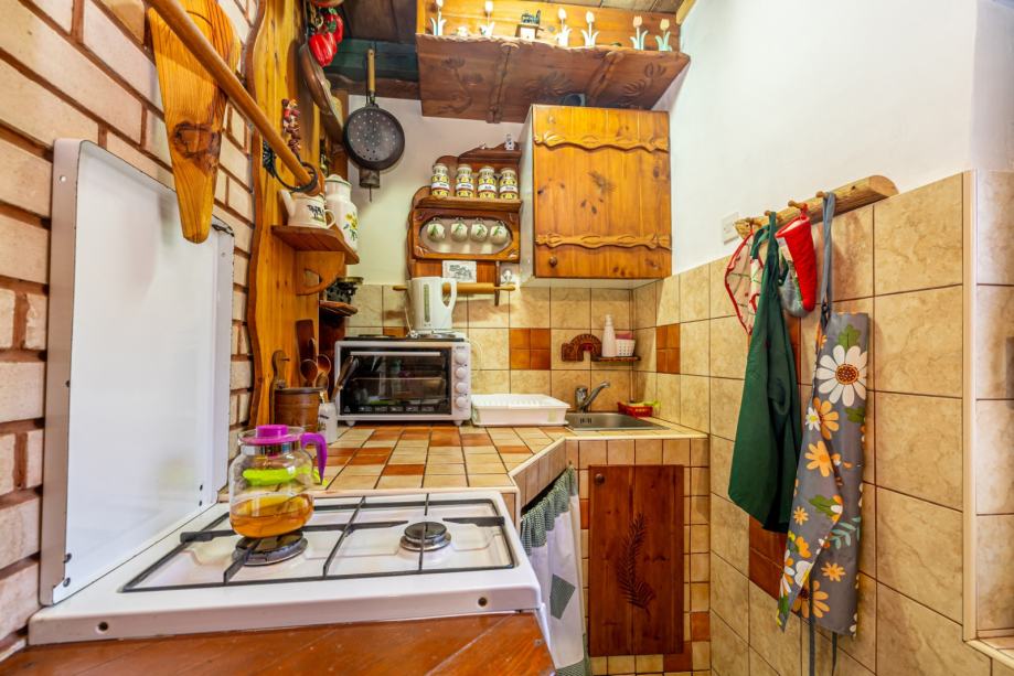 Sastoji se od prizemlja, u kojem je prostor dnevnog boravka, kuhinje, blagavaone, te hodnika i kupaonice i kata gdje se nalaze dvije sobe i ostava. Stambena površina je 65 m2, dodatno na parceli nalazi se konoba površine 14 m2, te natkriveni prostor s roštiljem. Savršena oaza mira, vikendica idealna za opuštajuće odmore.