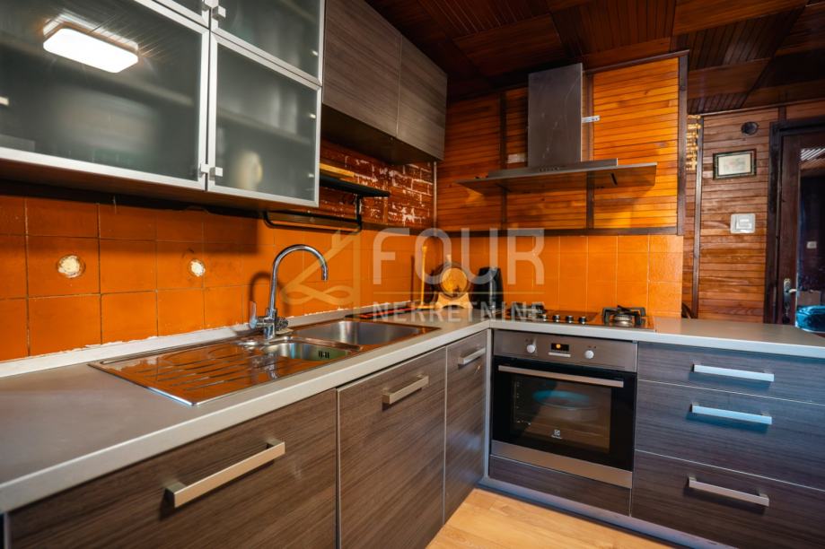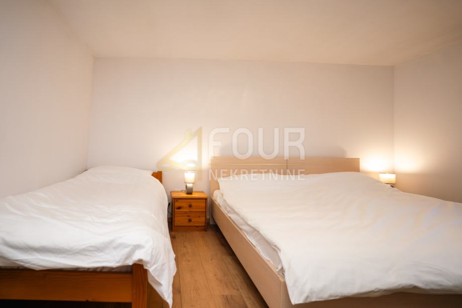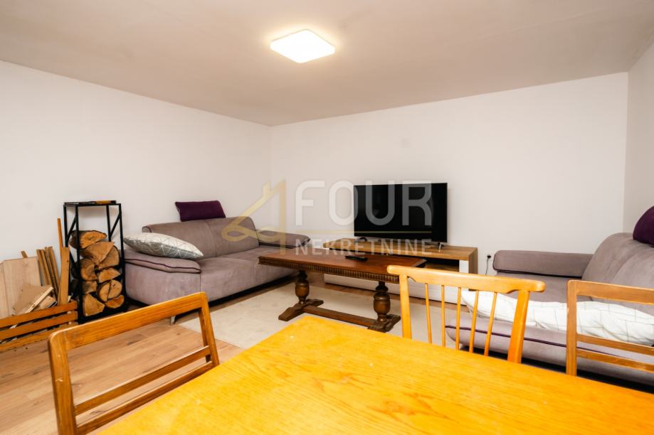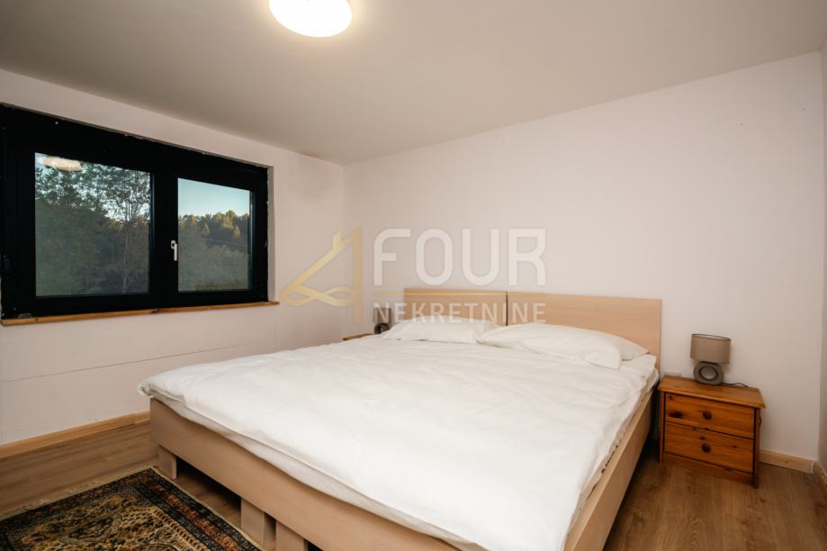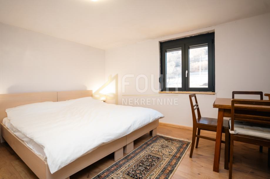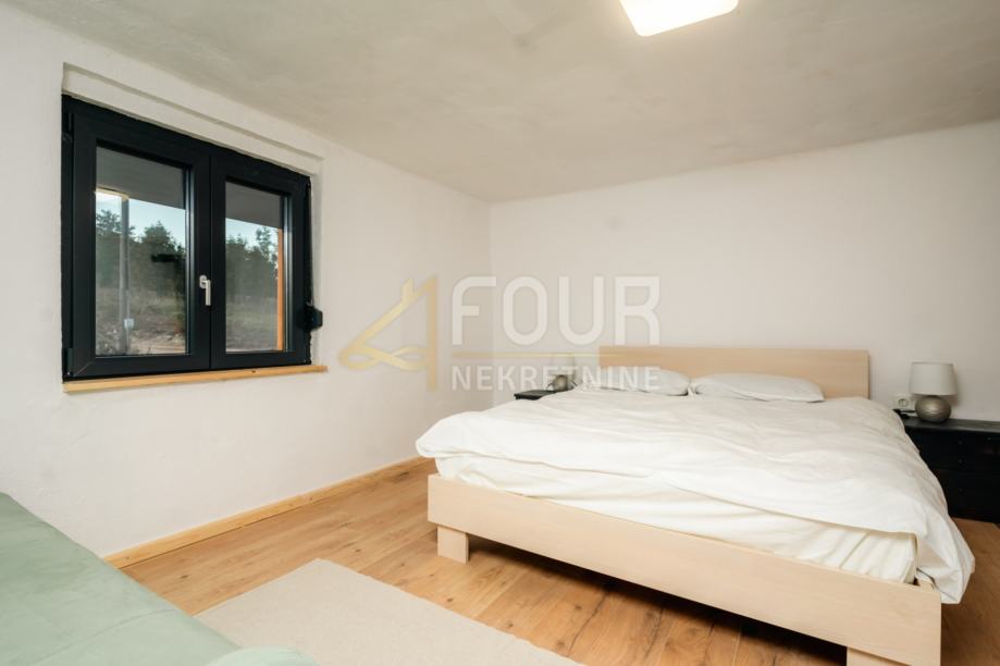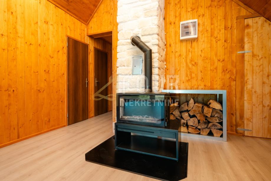 Kuća je djelomično adaptirana – obnovljen je krov, ugrađena je ALU stolarija, a fasada je obložena drvenim oblicama i izolirana stiroporom debljine 7 cm. U suterenu se nalazi ukopana konoba koja dodatno naglašava autentičnost prostora i pruža brojne mogućnosti korištenja. Prizemlje obuhvaća dnevni boravak, kuhinju, blagovaonicu i dvije spavaće sobe, dok se u visokom potkrovlju nalaze dnevni boravak, tri spavaće sobe i čitaonica, što osigurava dovoljno prostora za udoban obiteljski život.