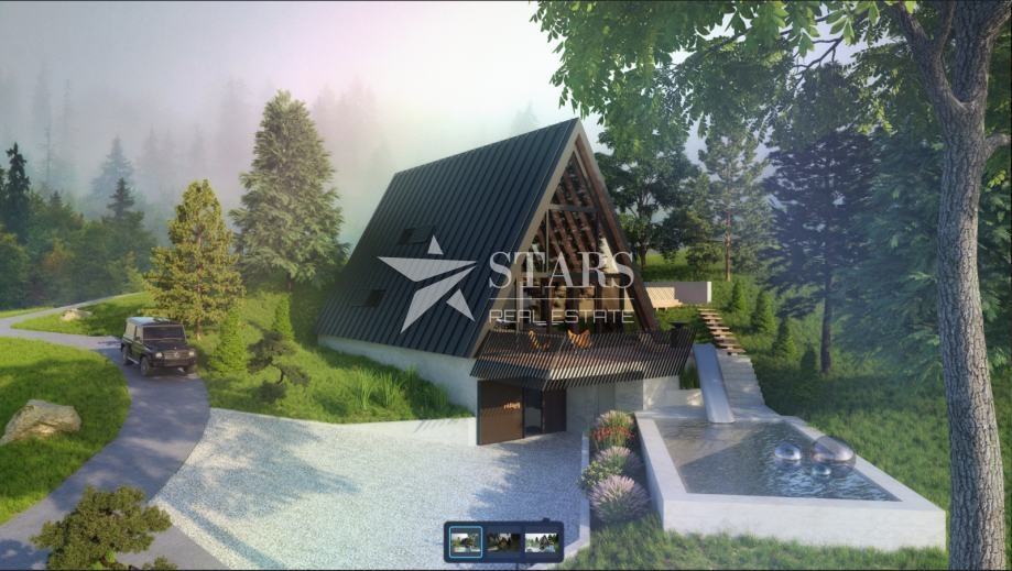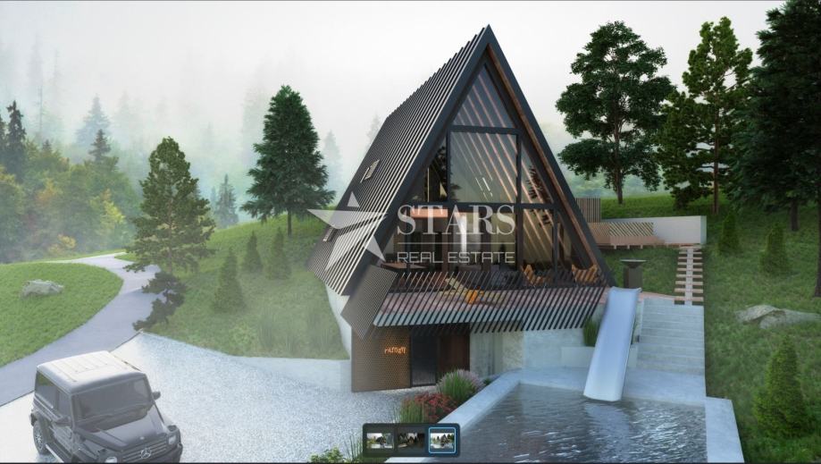 Uz zemljište dolazi glavni projekt za modernu A-Frame kuću od 200 m² s bazenom i saunom, spreman za ishođenje građevinske dozvole i sa već ishođenim posebnim uvjetima.