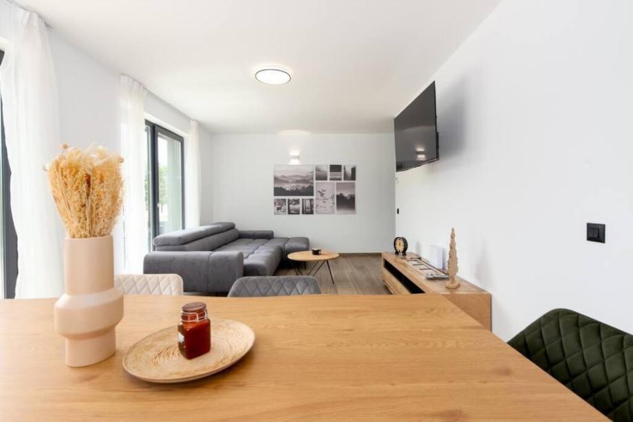 velika terasa s roštiljem, grijanje je podno na dizalicu topline, površina uređenog zemljišta iznosi 409 m2, mirno i povišeno mjesto okruženo šumom