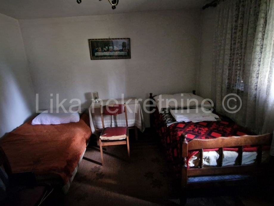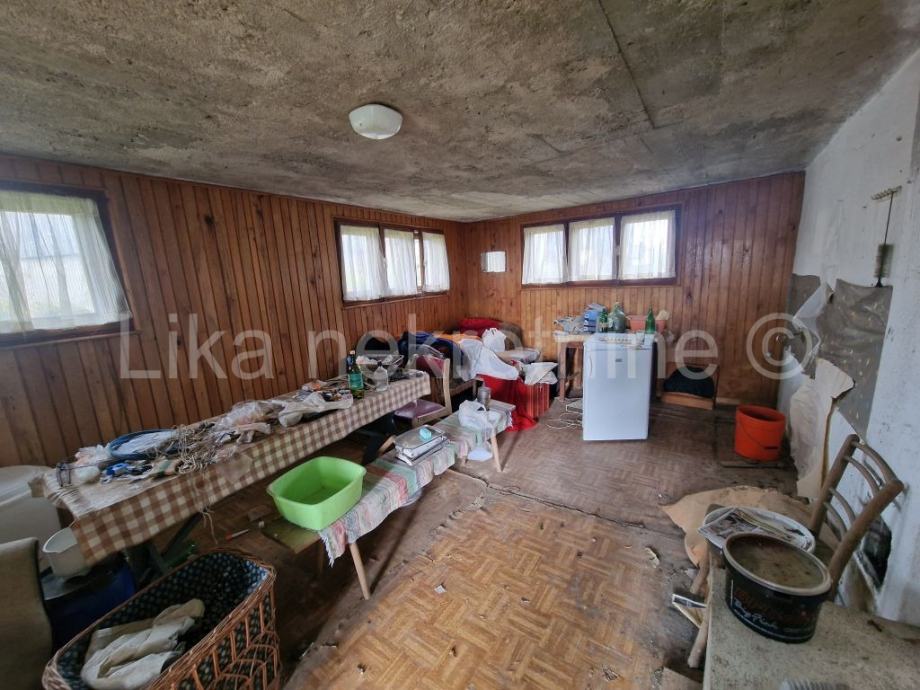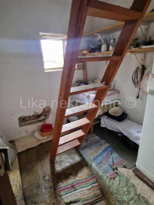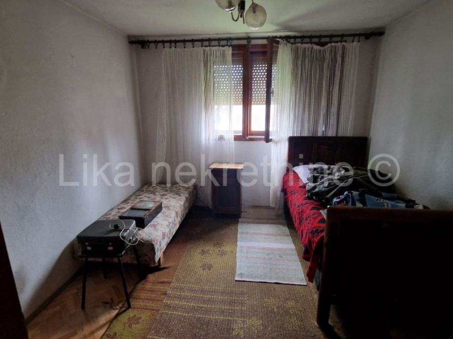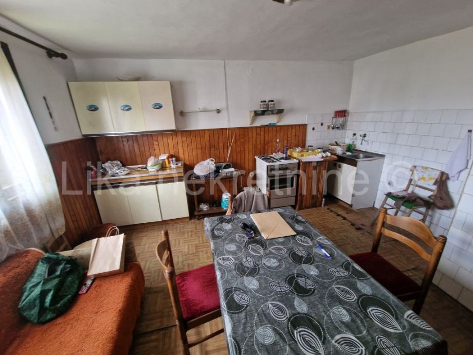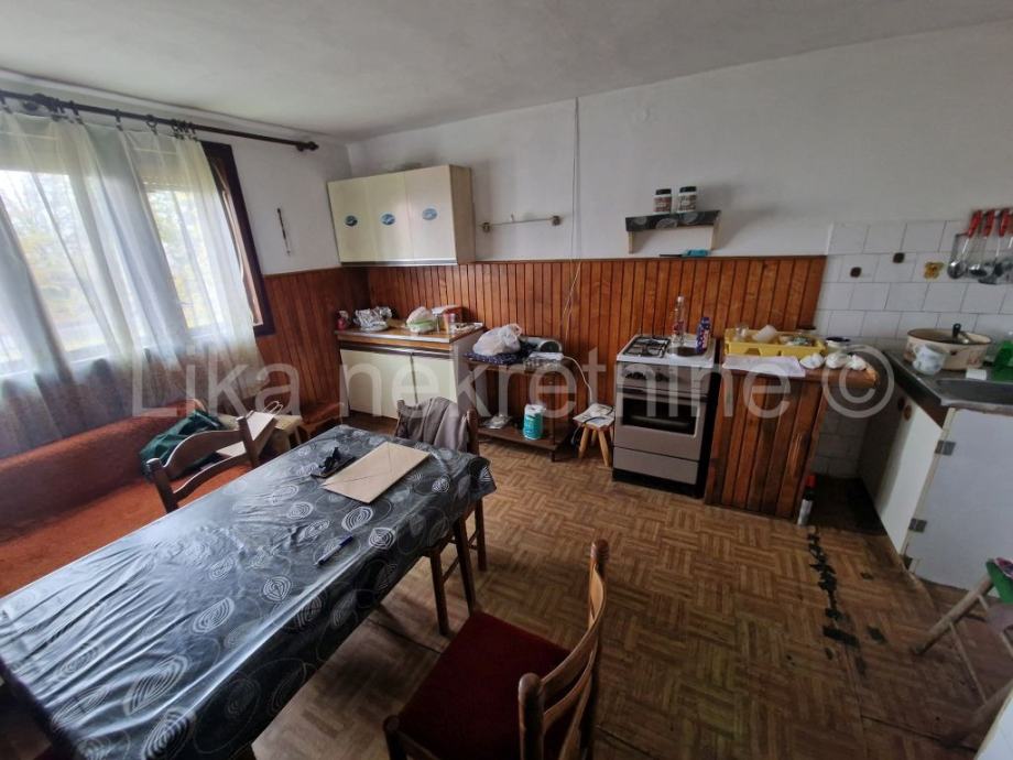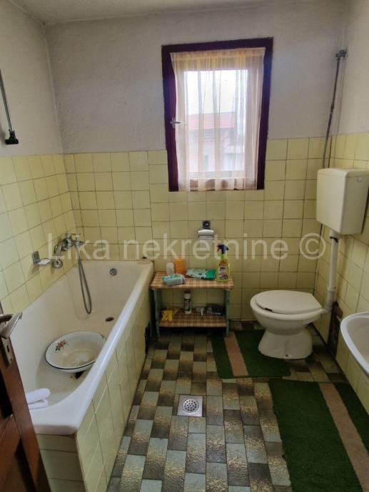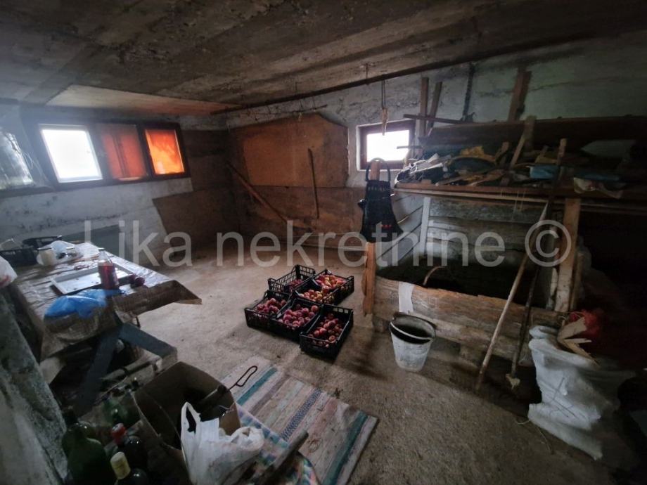 GOSPIĆ - Kaniška ulica, Obiteljska kuća katnica 9,30 x 12,40m ( Pr+ Kat +Potk ), sastoji se od suterena u kojem su dvije velike prostorije, jedna se koristila kao kuhinja i blagovaona a druga kao ostava ( trap za krumpir, ostava zimnice i drugih kućnih potrebština ) svaka prostorija ima po tri prozora sa puno dnevnog svijetla. Na kat vode betonske stepenice te se ulazi u hodnik iz kojeg se ide u kupatilo i wc, te drugi hodnik iz kojeg je ulaz u dvije spavaće sobe, kuhinju i špajzu iz koje vode drvene stepenice na kat - potkrovlje koje je visoko i moguće je urediti još jedan stan. Kuća ima struju i vodu, te septičku jamu, kanalizacija nije spojena a u samoj blizi je. Kuća zahtjeva adaptaciju i uređenje jer je građena 1971.godine.