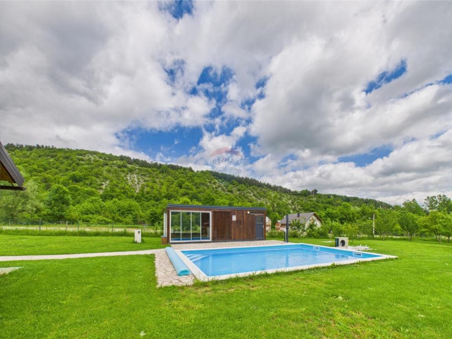 Bazen u sklopu imanja sa puno sadržaja i za djecu, nogometni teren, ljuljačke te prostrana okućnica 2270 m2 kao idealan prostor za odmor.