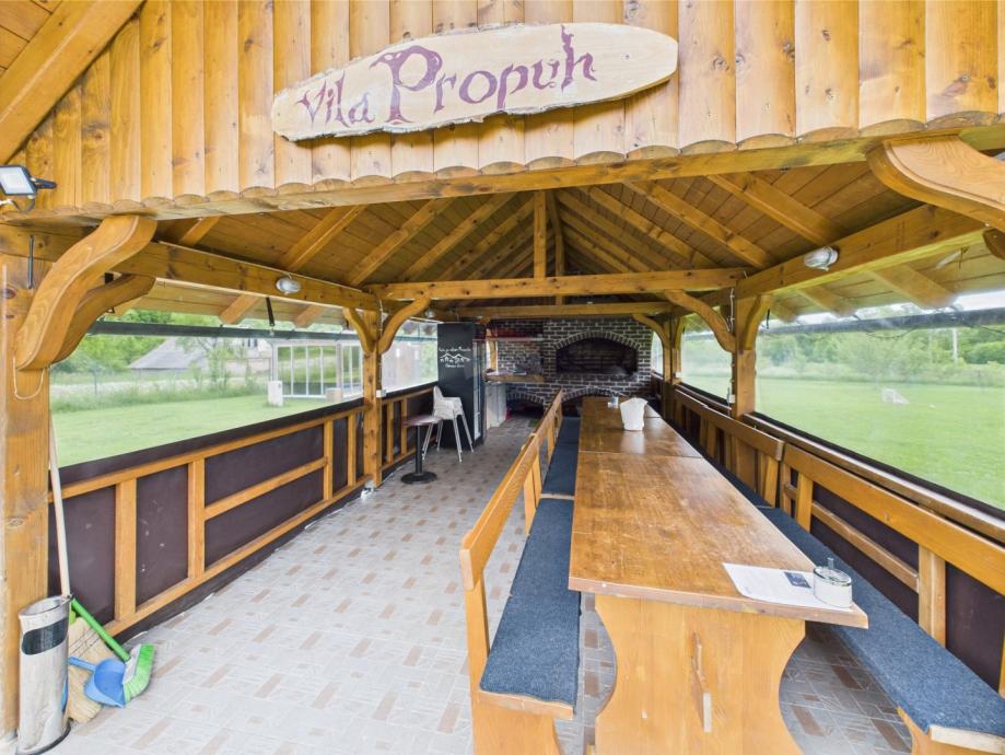 Ljetna kuhinja u kojoj se nalazi peka i roštilj sa drvenim klupama i stolom za sve goste imanja.