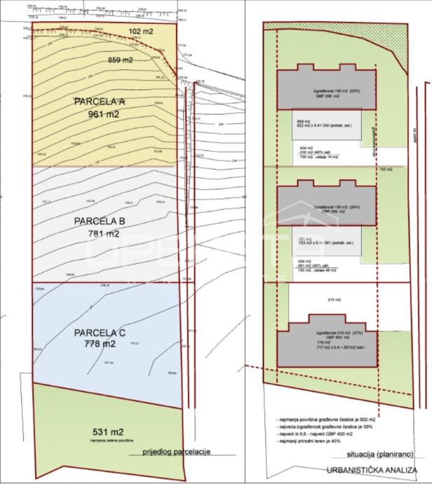 Prodaje se odlično, pravilno zemljište blagog nagiba za izgradnju ukupno 3 ili 4 objekta po max 400 brp-a. Idealno za gradnju urbanih vila ili obiteljskih kuća.