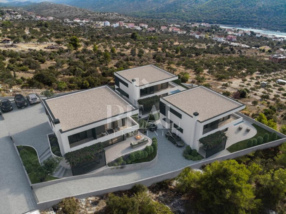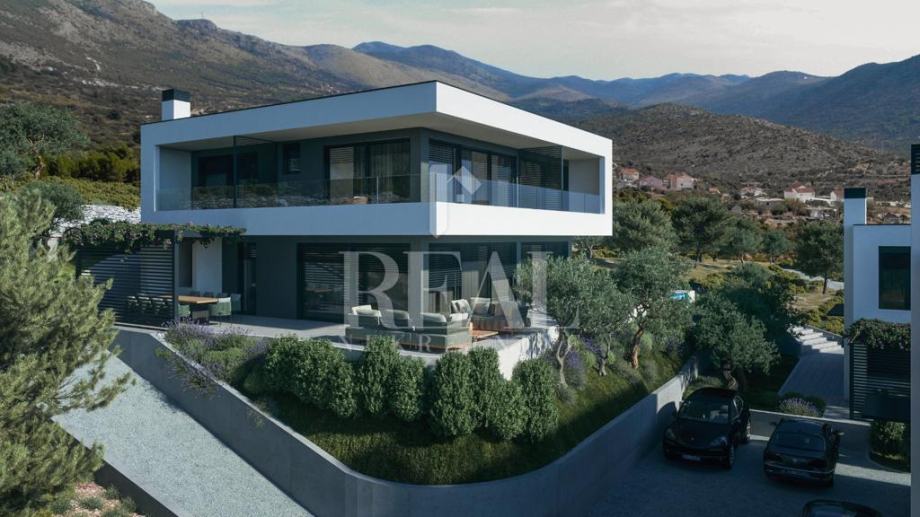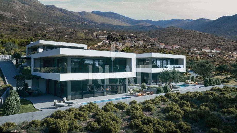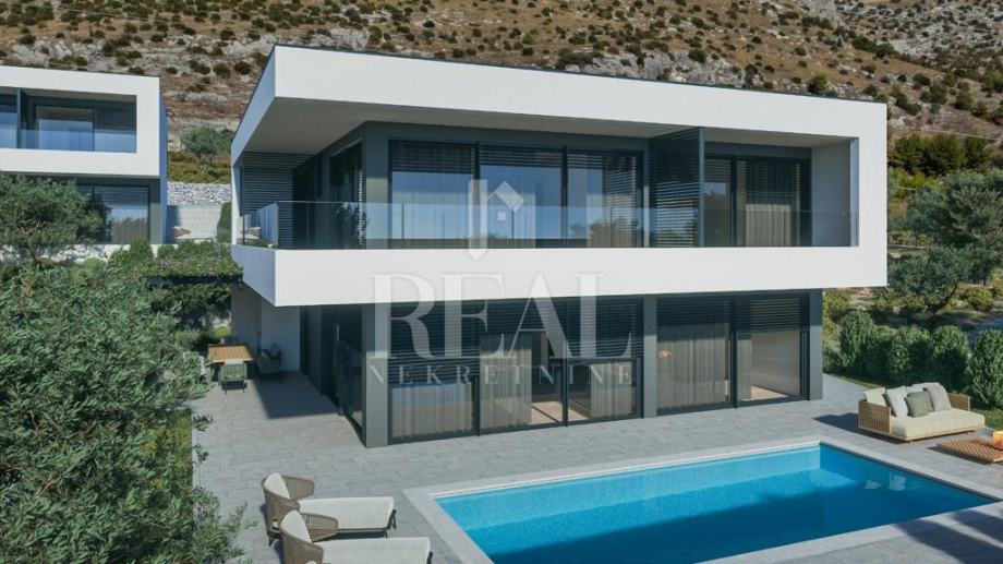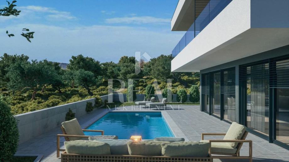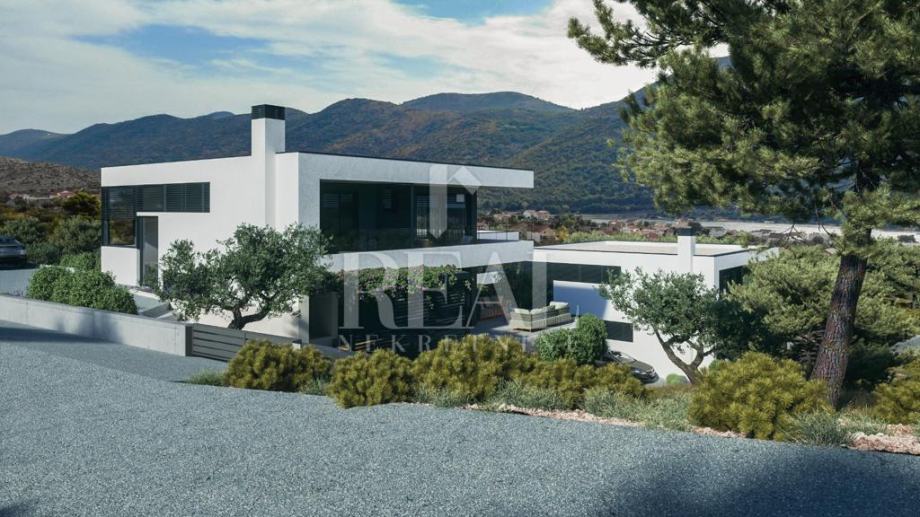 Građevinsko zemljište sa pravomoćnom građevinskom za kuću sa bazenom površine 220 m2 koja se sastoji od kuhinje ,blagovaone, dnevnog boravka, wc, natkrivene terase u prizemlju te tri master sobe sa kupaonama i balkonom na katu. Za građevinsku dozvolu su plaćene komunalije i dovedena voda o vlastiti trošak i pristupni put. Može se kupiti i kompletan projekt od tri kuće. Kuća ima pogled na more i udaljena od mora 500 m.