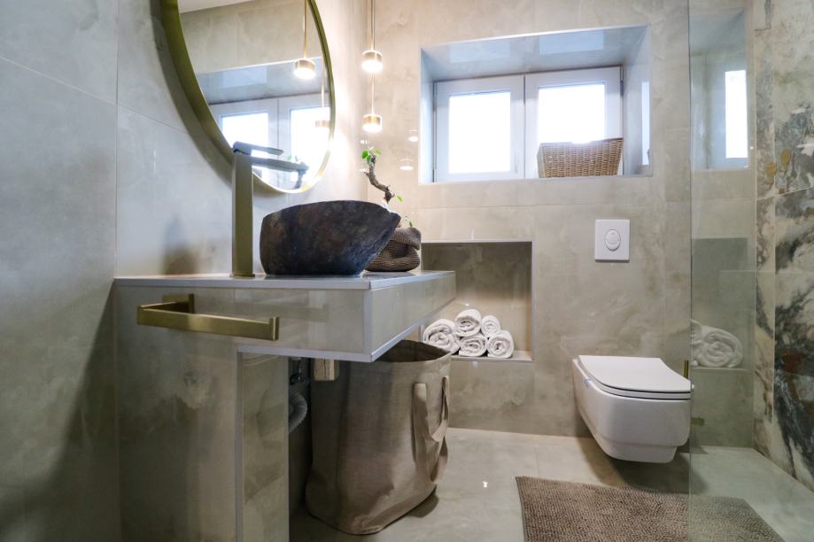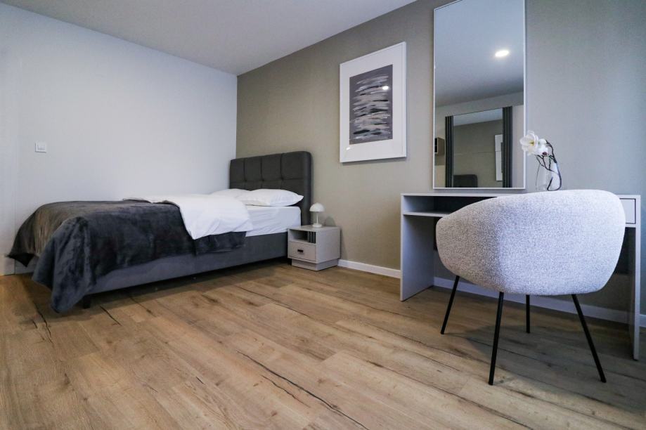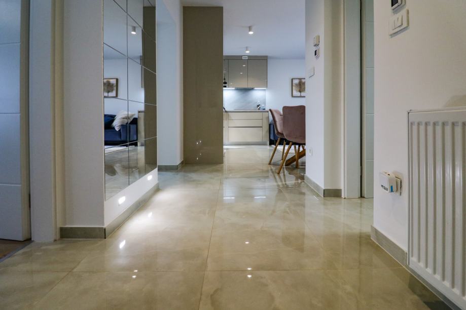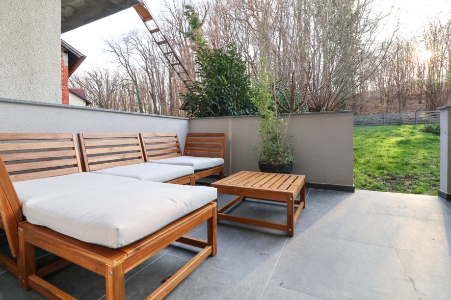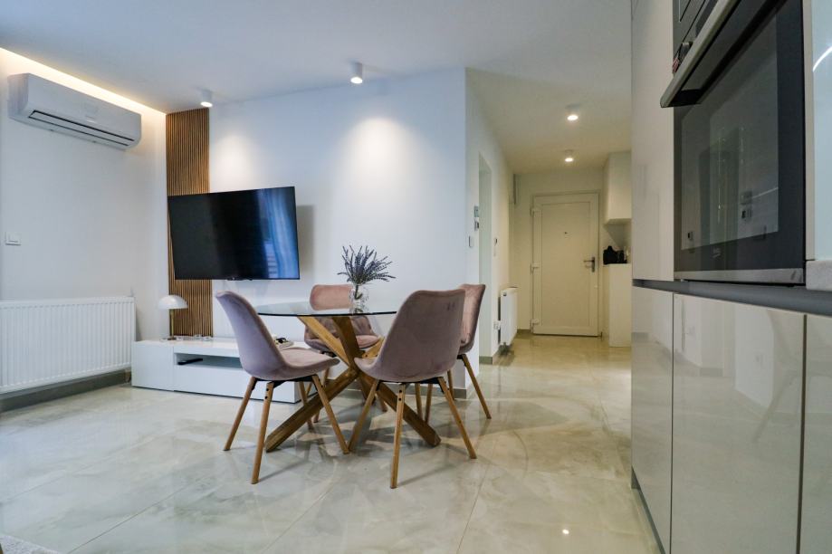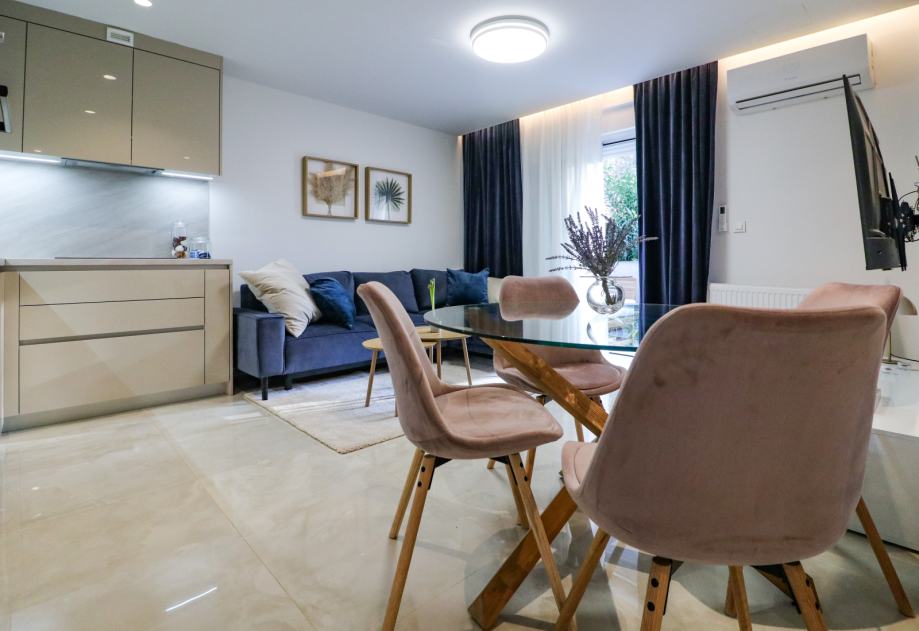 Stan ostavlja odličan dojam, prekrasno je uređen, svijetao i iznimno uredan. Sastoji se od ulaznog hodnika, dvije sobe od kojih jedna ima walk-in ormar, dnevnog boravka koji je spojen s kuhinjom i blagovaonom, kupaonice, ostave, balkona i terase koja ima izlaz u zajednički vrt.