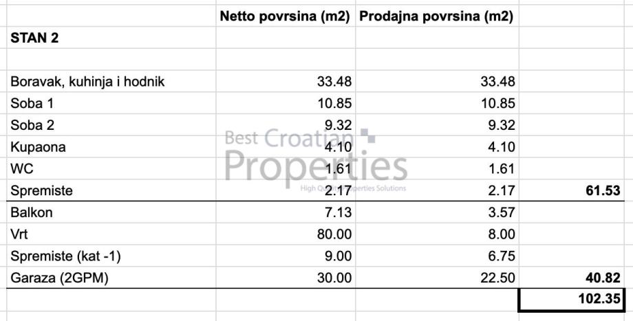 Stan je neto korisne površine 102,35m2 na prvom katu urbane vile od 3 stana (ukupno 2 kata) i sastoji se od prostranog dnevnog boravka s kuhinjom i blagovaonom, dvije spavaće sobe, kupaonice, WC-a, privatnog vrta orijentacije sjever-istok te natkrivenog balkona.
