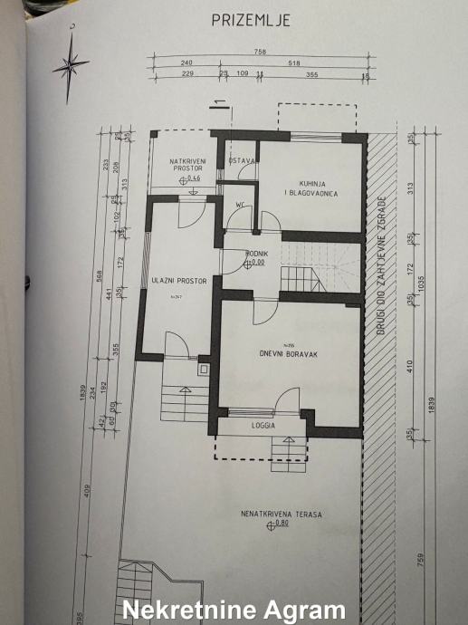 Prizemlje- velika terasa sa ulazne strane, vrt sa stražnje strane, veliki ulazni hodnik, kuhinja sa blagovaonom, ostava, dnevni boravak, wc.