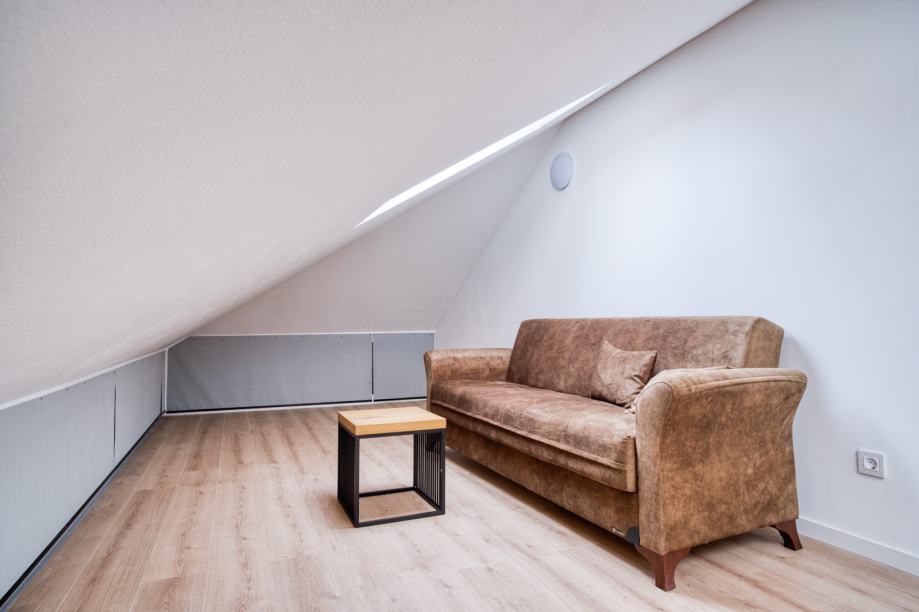 Na galeriju se dolazi drvenim stepenicama iz dnevnog boravka, gdje je smješten lijepi trosjed i niski stolić za kavu. Idealno mjesto je za čitanje knjige ili rješavanje poslovnog zadatka u vlastitom miru.