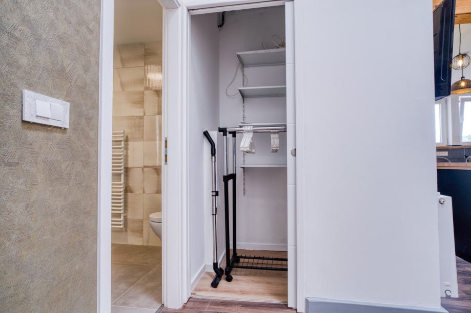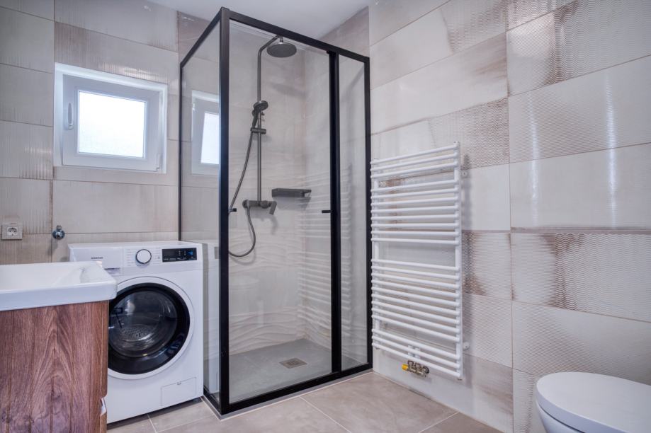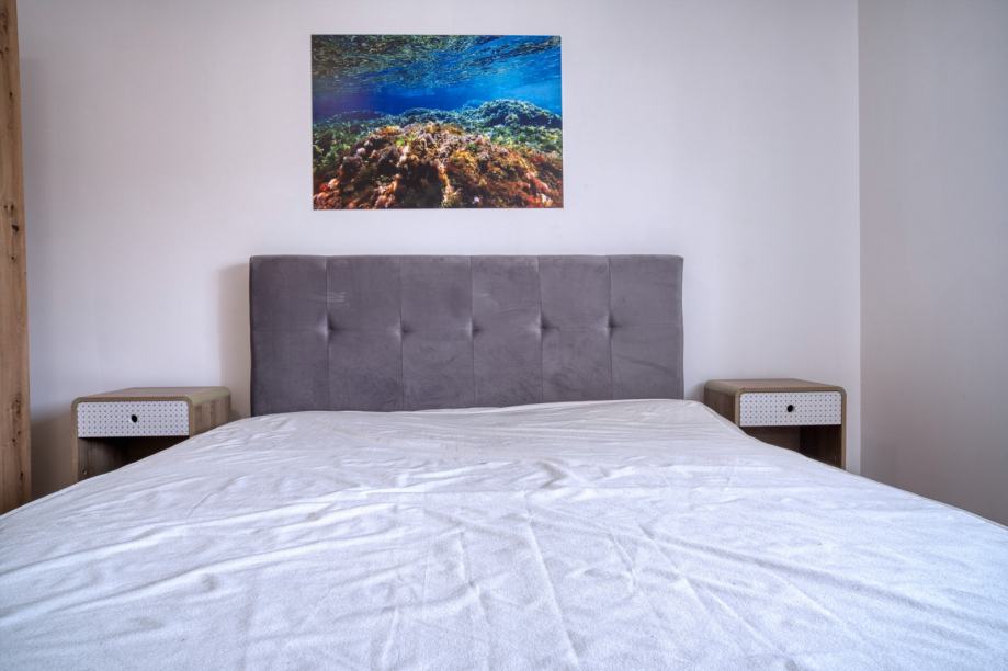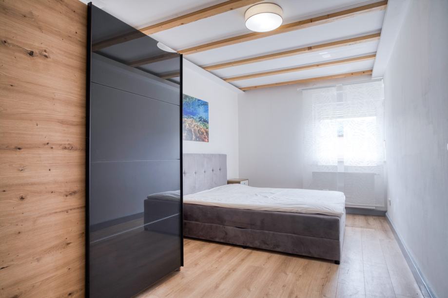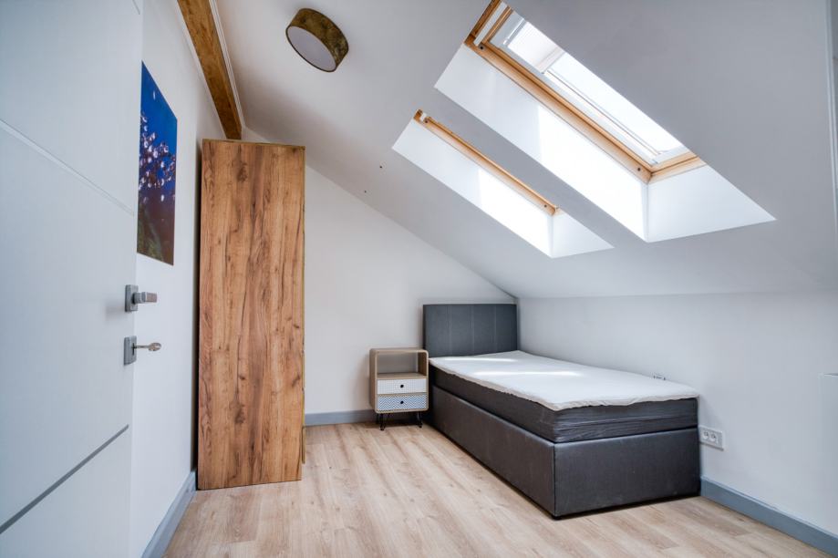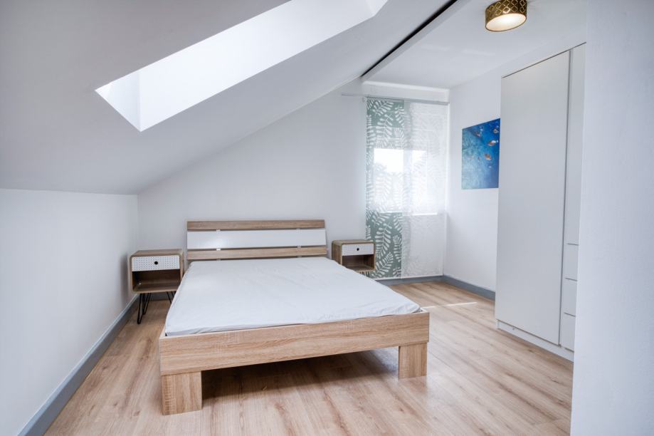 Veća spavaća soba s ravnim stropom i standardnim prozorom opremljena je bračnim krevetom i velikim ormarom s kliznim vratima. Druga spavaća soba ima djelomično kosi strop, dva prozora (jedan je krovni) i opremljena je bračnim krevetom i ormarom. Treća, najmanja spavaća soba, opremljena je jednostrukim krevetom, ormarom te ima dva krovna prozora. Kupaonica je opremljena velikim “walk-in” tušem sa staklenom stijenom te perilicom rublja. Stan također ima odvojeni toalet, veliko spremište i puno ugradbenih ormara.