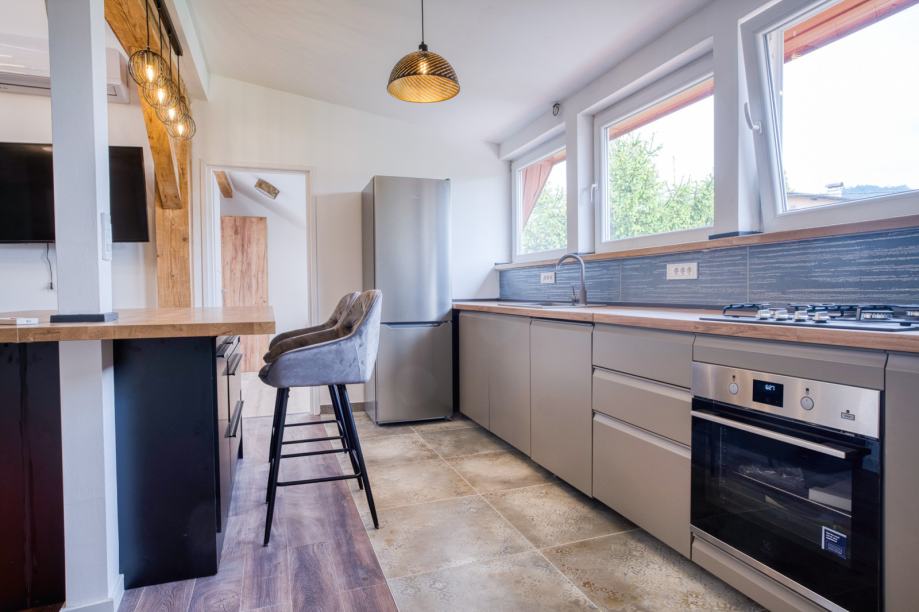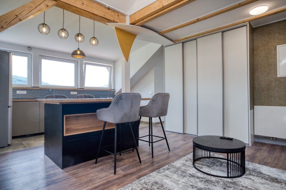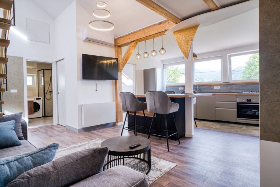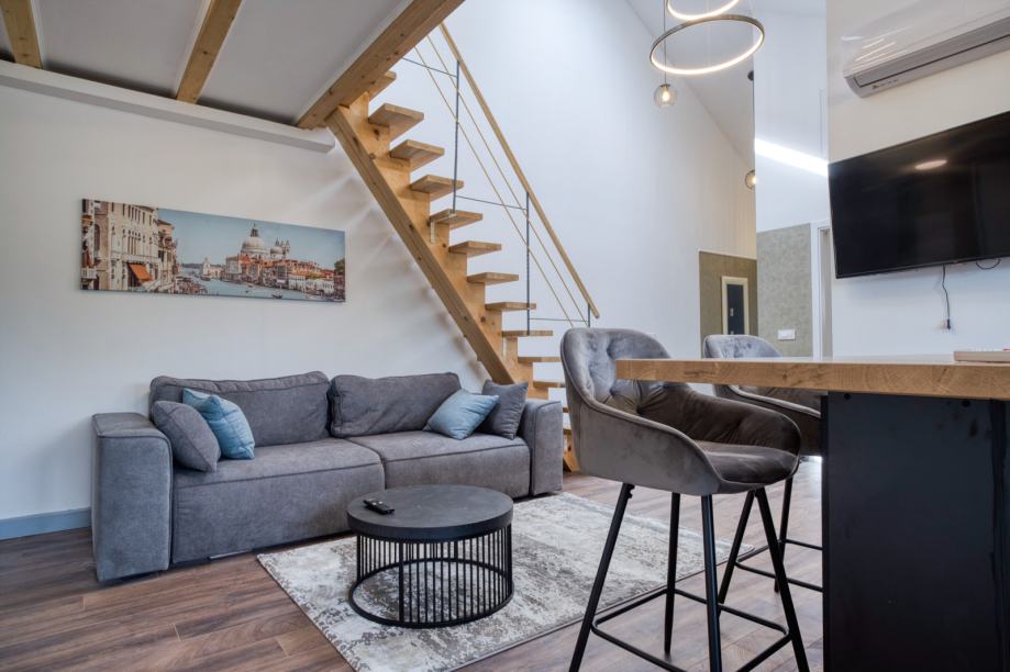 Na donjoj etaži stana nalaze se prostran “open-space” dnevni boravak s visokim stropom, spojen s kuhinjom i blagovaonskom zonom, tri spavaće sobe, kupaonica i toalet. Dnevni boravak je namješten novim kvalitetnim namještajem: udobni trosjed, visoki blagovaonski stol s četiri barske stolice, potpuno opremljena kuhinja s puno radnih površina. Na zidu iznad velikog televizora instaliran je klima uređaj.