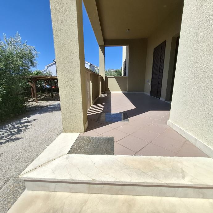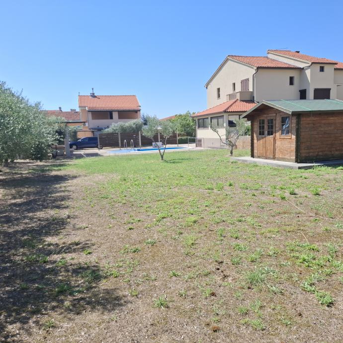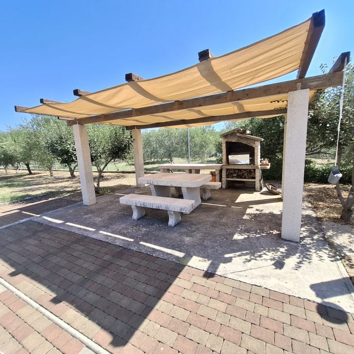 U dvorištu se nalazi uređeni parking za četiri vozila, dok na prostranoj okućnici je moguće još parkirati i više automobila. U dvorišto se također nalazi i roštilj sa provedenom strujom i vodom, te kameni stol sa kamenim sjedištima i nadstešnicom, dok u nastavku se nalazi ravan teren pun mediteranskog bilja, drva maslina (20), a koje je moguće iskoristiti za dodatni sadržaj (tenis teren i sl.).