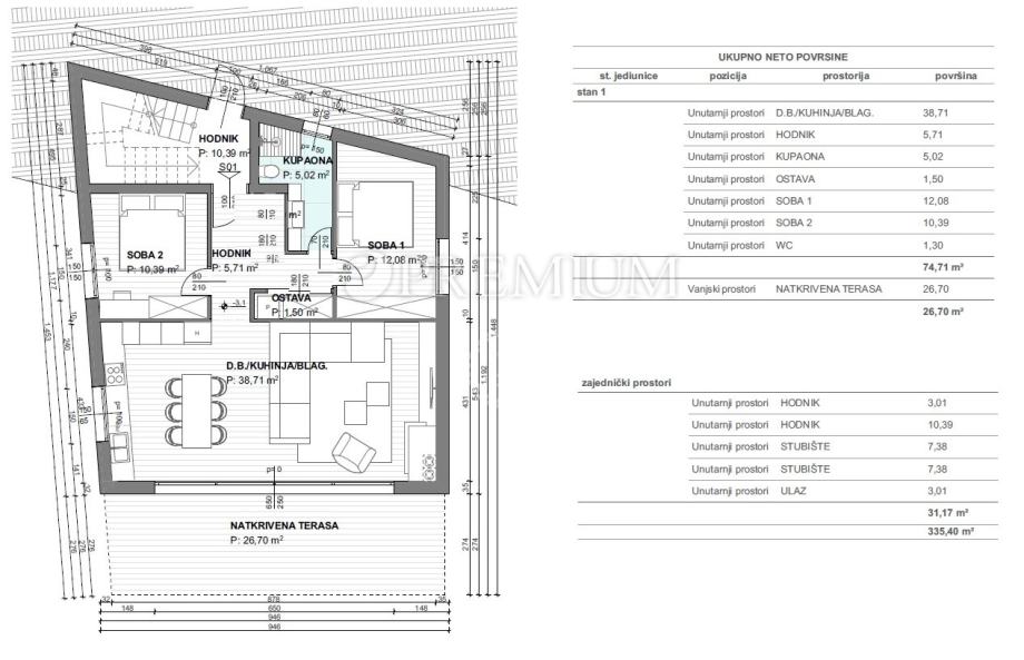 Apartman površine 88m2 sastoji se od ulaznog hola, dvije udobne spavaće sobe, kupaonice, praktično spremište (1,05m2), kuhinja s blagovaonicom te prostrani dnevni boravak s izlazom na natkrivenu terasu ( 26,70m2*0,5= 13,35m2).