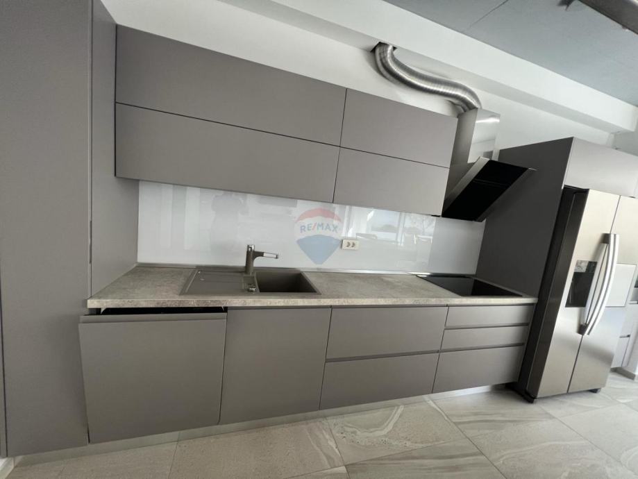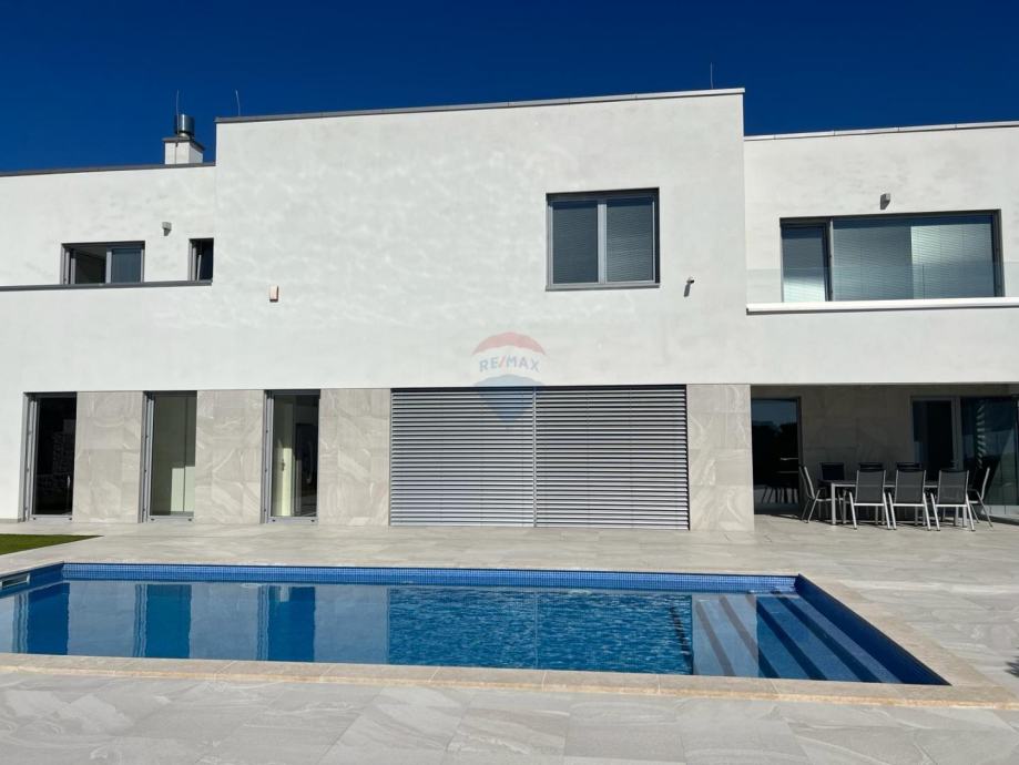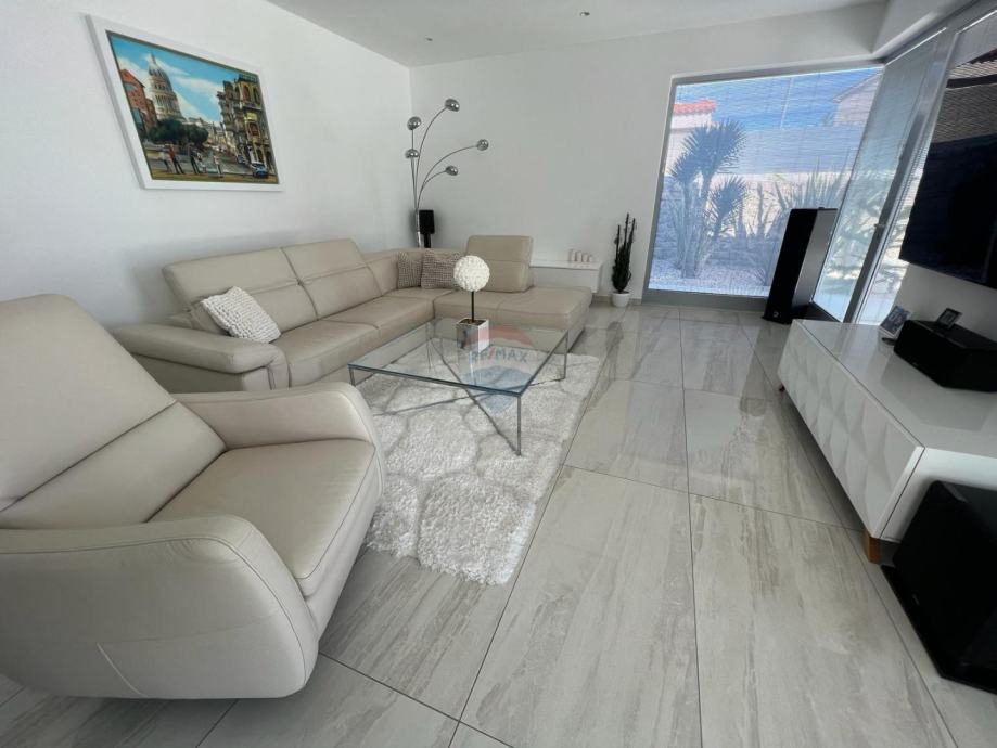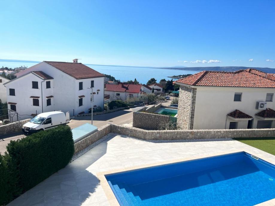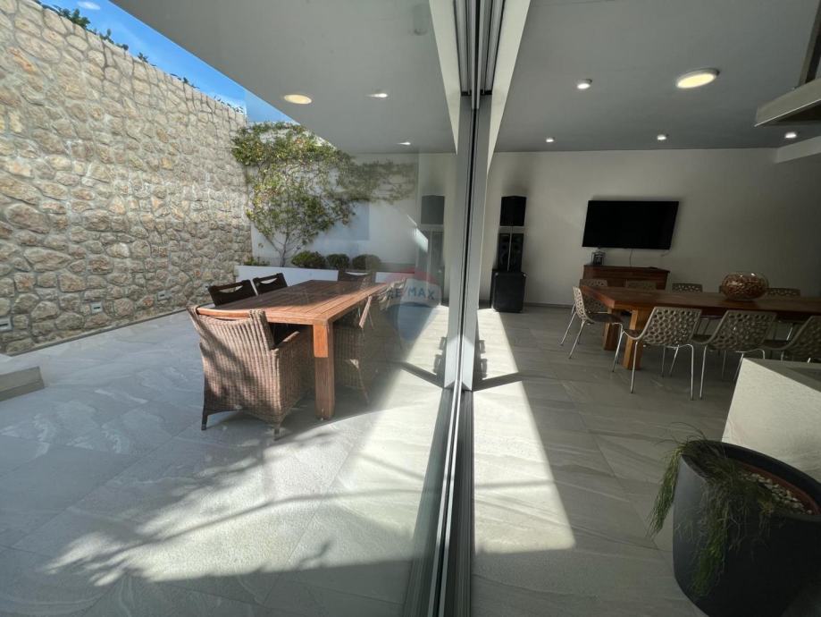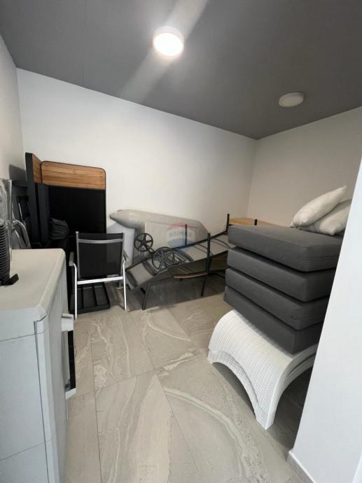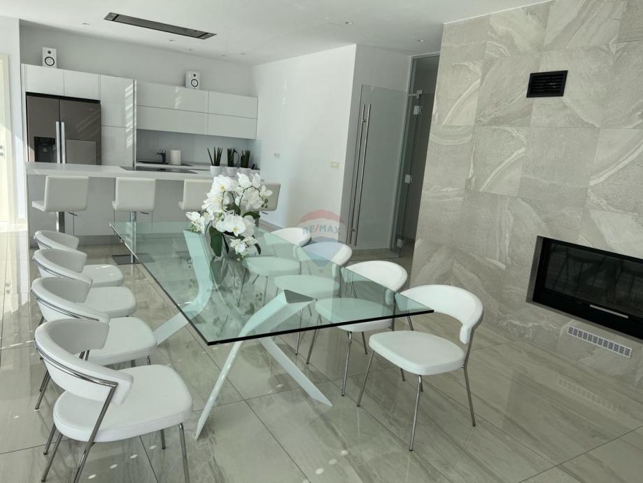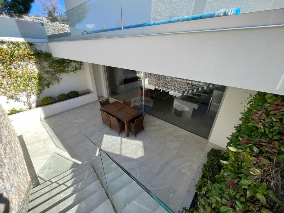 Prizemlje se sastoji od velike kuhinje, blagovaonice, wc-a, dnevnog boravka sa velikim kliznim stjenama kroz kojih se izlazi na okućnicu s bazenom i predivnim pogledom na more. U nastavku se nalazi garaža za dva automobila, i prostorijom za pohranu stvari.